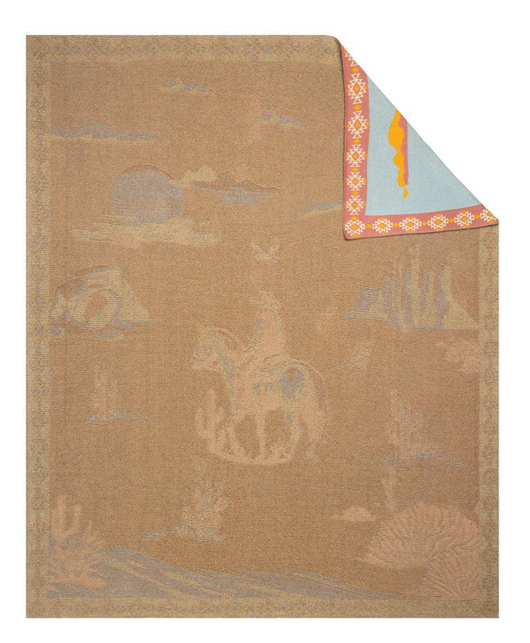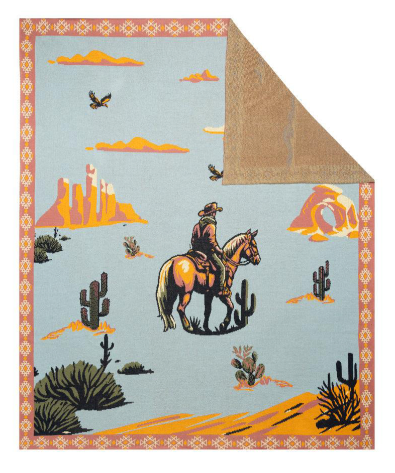 Featuring vibrant, bold colors, this eye-catching throw showcases a spirited bronco rider, galloping horse, desert cacti, and Aztec-inspired designs, all woven into one unforgettable scene. Whether you're decorating a ranch-style space or gifting a fellow cowboy or cowgirl, this throw is a cozy tribute to life on the range.