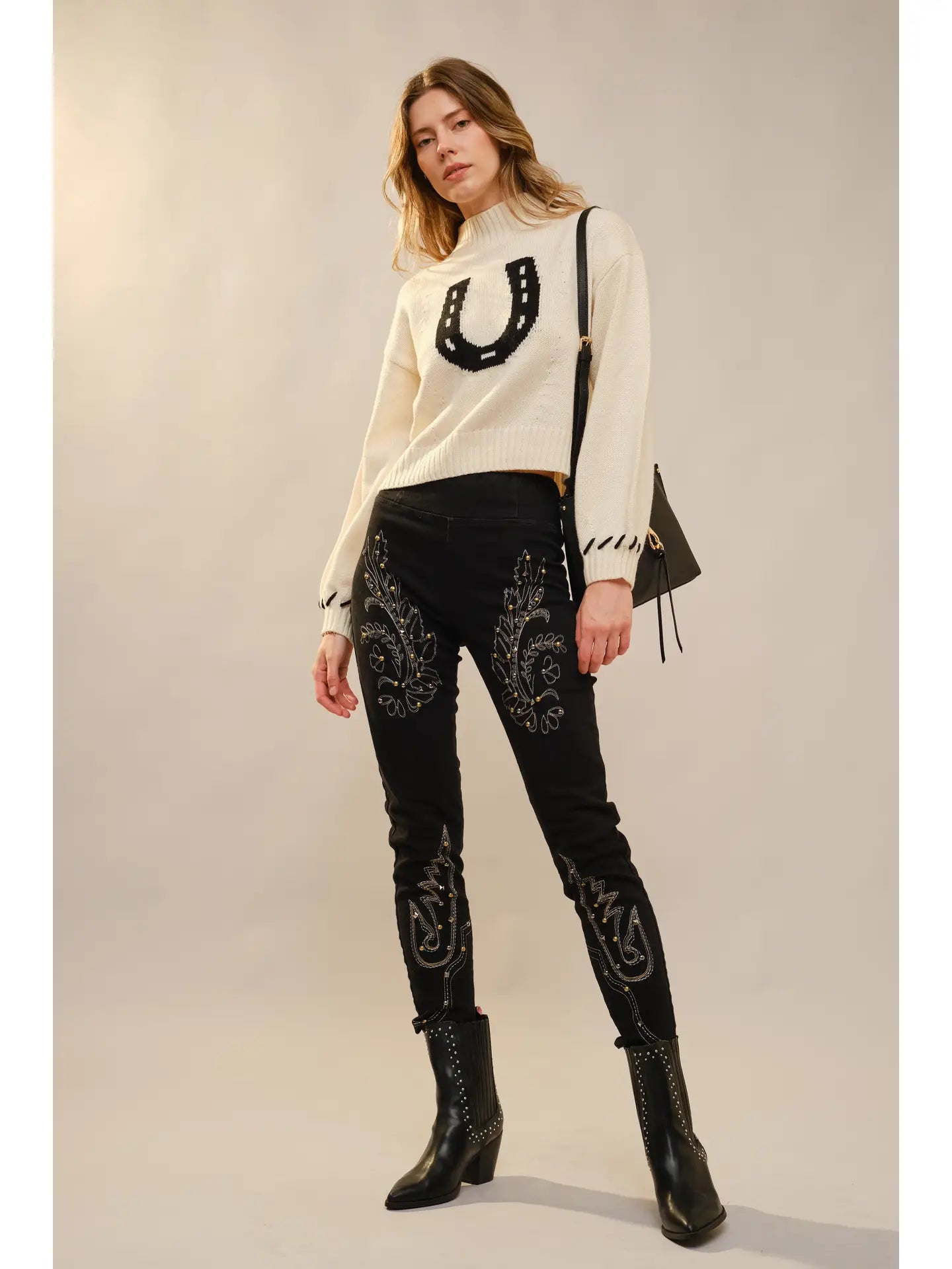 Add a touch of western charm to your winter wardrobe with the Lucky Stitch Sweater — where cozy comfort meets cowgirl spirit. This cream cropped knit features a bold black horseshoe graphic front and center, symbolizing luck and confidence. The mock neck design and mini balloon sleeves offer a flattering, modern shape, while black whipstitch detailing along the sleeves adds a handcrafted, rustic finish.