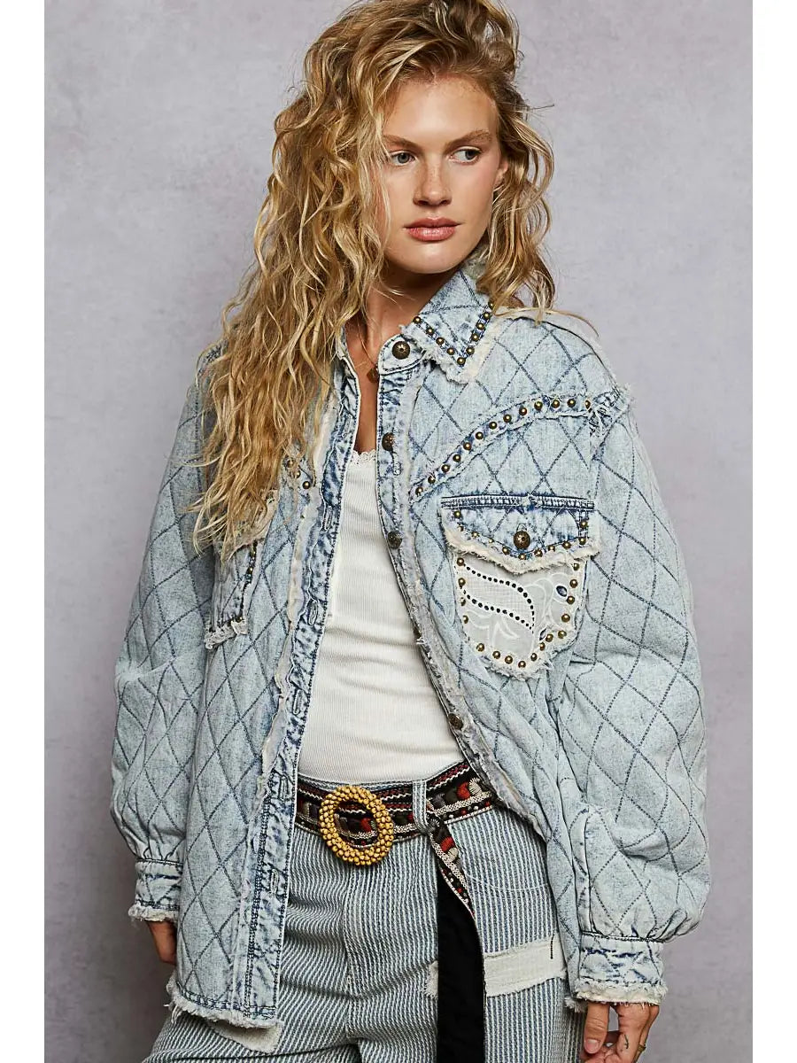 The Mesa Aurelia Quilted Shacket is a statement of elevated western design — where rugged denim meets couture-level detailing. Crafted from quilted denim for structure and texture, this button-down collared silhouette is adorned with brushed gold studs and panels of delicate eyelet lace. Frayed edges give it a lived-in, artfully distressed finish that balances refinement with authenticity.
