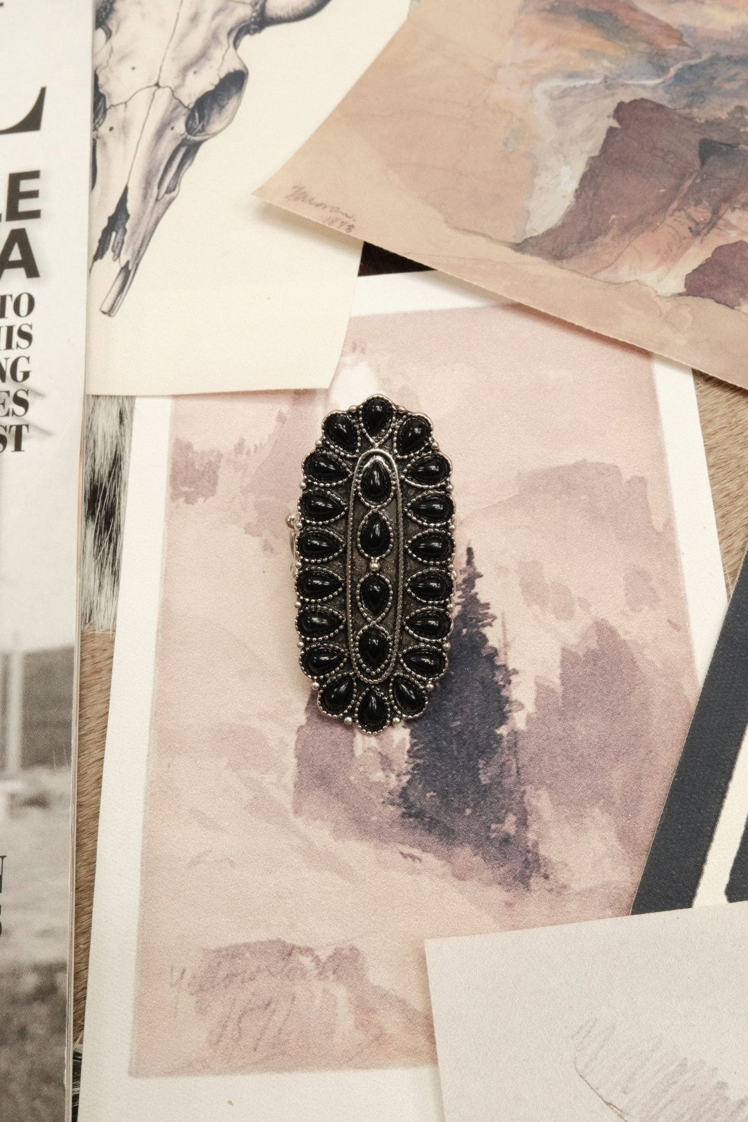 Make a bold statement with the Midnight Range Stretch Ring — a sleek western accessory with just the right amount of edge. The oblong centerpiece is encrusted with shimmering black stones, catching the light with every move while keeping a rugged, cowgirl‑chic vibe. Designed with a stretchy comfort band, it slips on easily and fits most sizes, making it an effortless addition to your jewelry rotation.