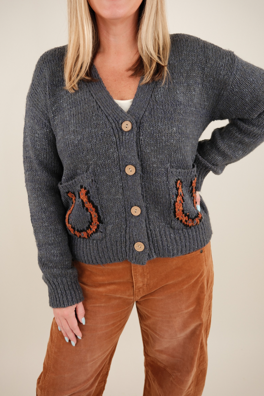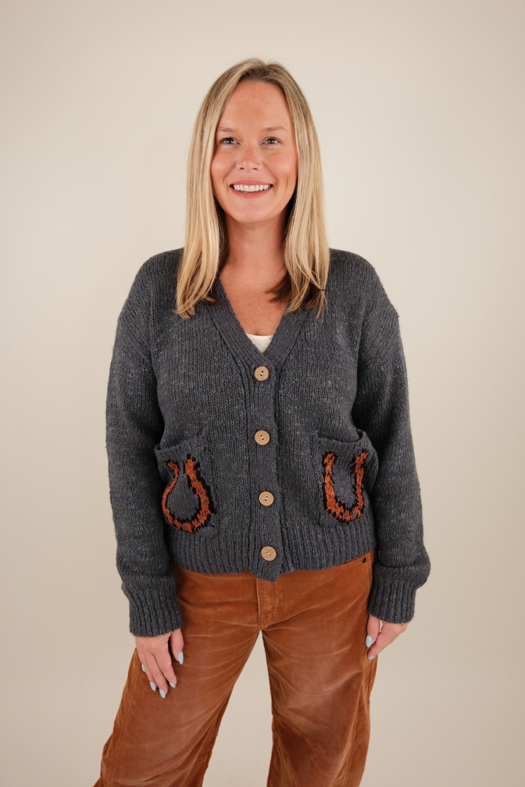 Make a statement in the Midnight Rider Cardigan, a western-inspired knit that blends everyday comfort with bold equestrian flair. In a deep midnight blue, this v-neck cardigan features a three-button front and two small patch pockets, each detailed with a lucky horseshoe motif. The back steals the show with a striking horse head design, making this cozy piece as eye-catching from behind as it is from the front.