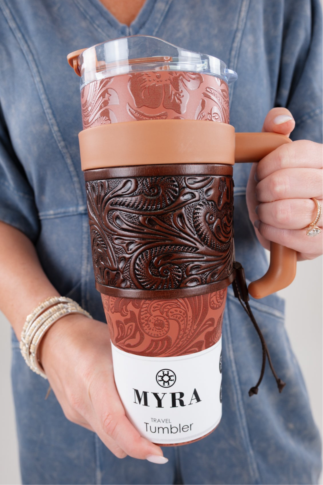 Stay wild and sip in style with the MYRA Desert Rose Travel Tumbler! This stunning tumbler features a rich cognac floral print base wrapped with a bold, beautifully hand-tooled dark leather band, giving it a rustic, boutique-worthy western flair.