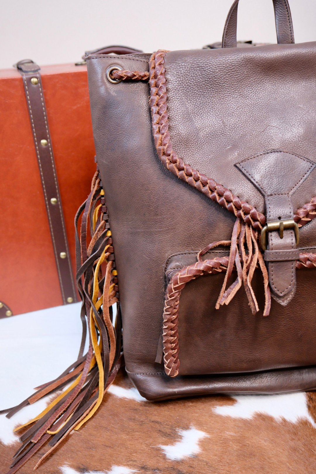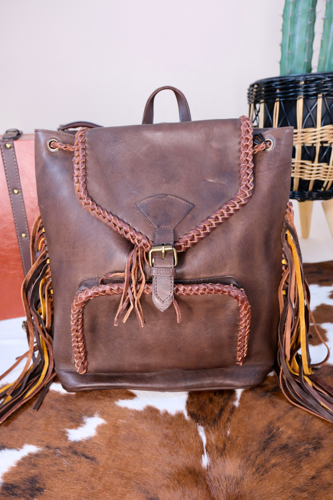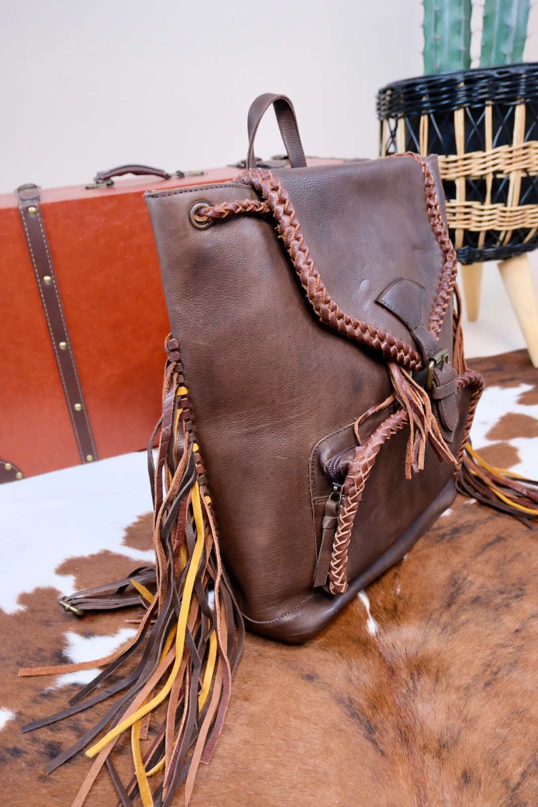 The Painted Prairie Fringe Backpack is where artisan craftsmanship meets free-spirited western flair. Made from 100% genuine leather, this backpack measures a generous 15" x 16", giving you room for all your essentials whether you're roaming a festival, riding trails, or exploring the open road.