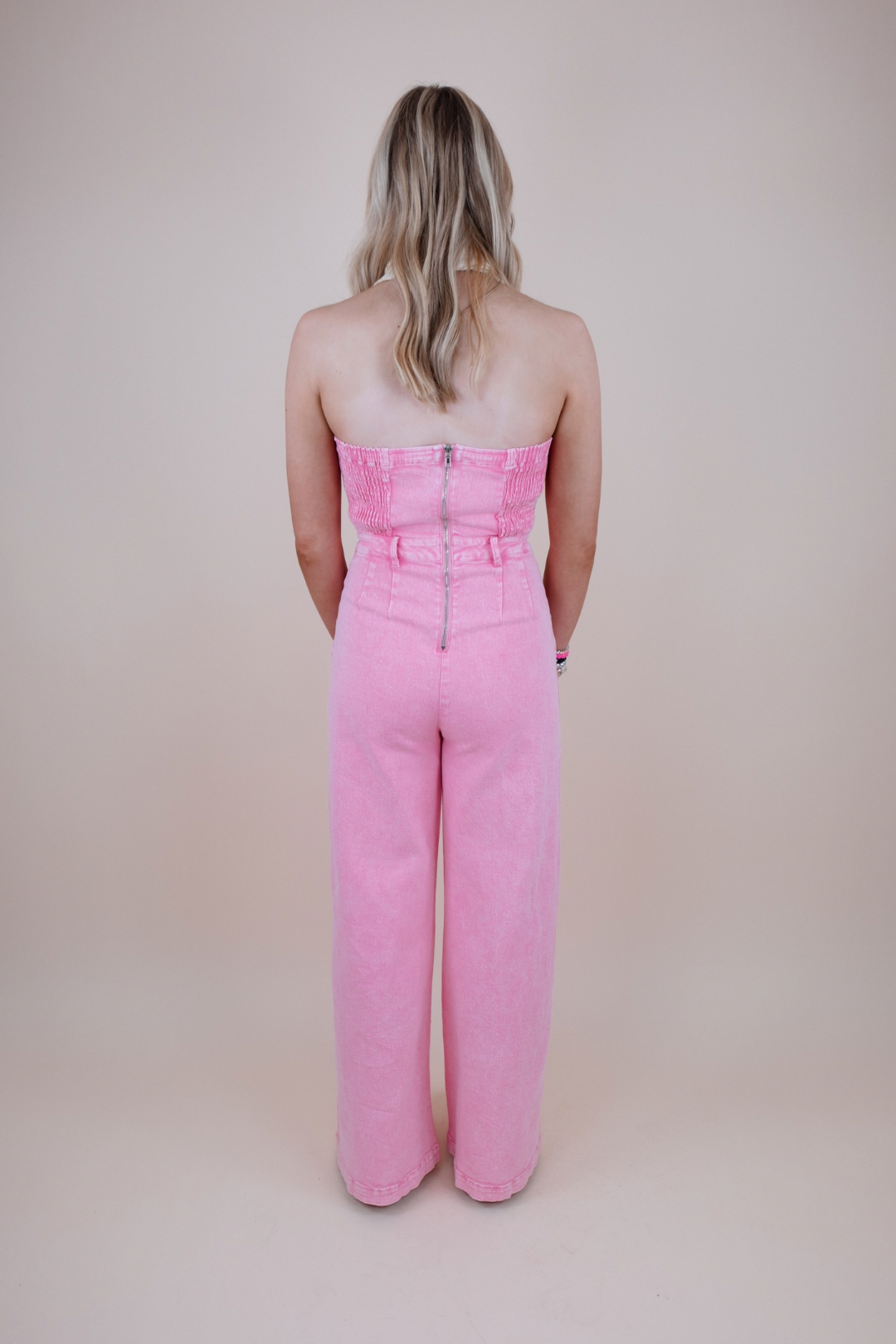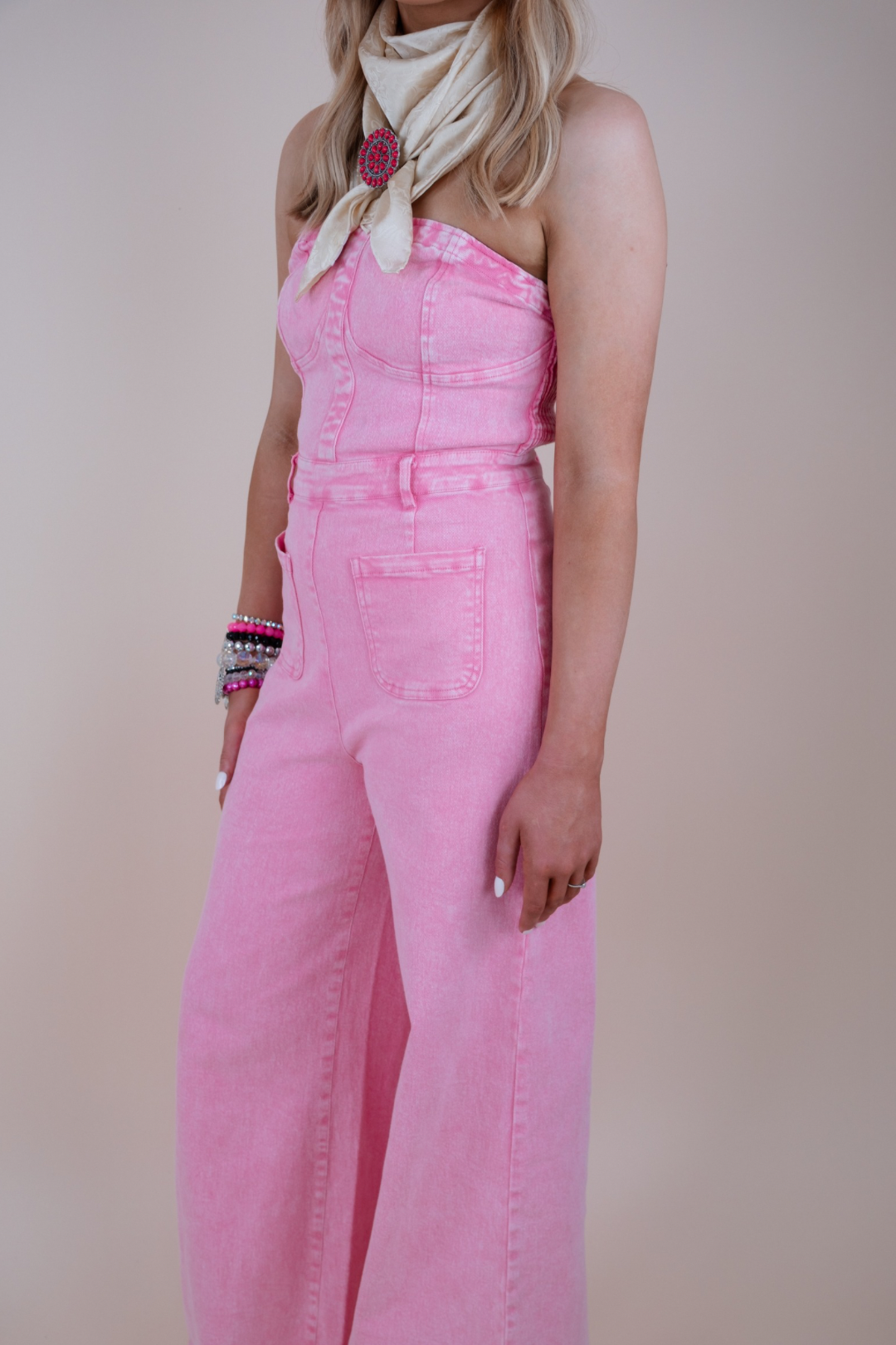 Turn the trail into your runway in the Pink Trails Denim Jumpsuit—a strapless, wide-leg knockout designed to steal the show. Made from bold pink-dyed denim, this piece cinches at the waist to highlight your shape, while the structured top and flared legs bring vintage rodeo vibes into the now. Whether you're headed to a summer concert or two-steppin' under the stars, this jumpsuit brings the confidence—and the compliments.