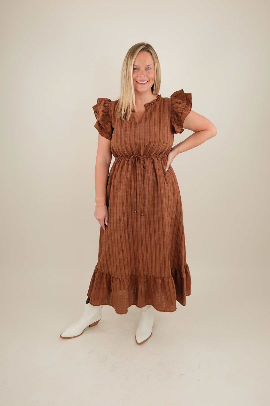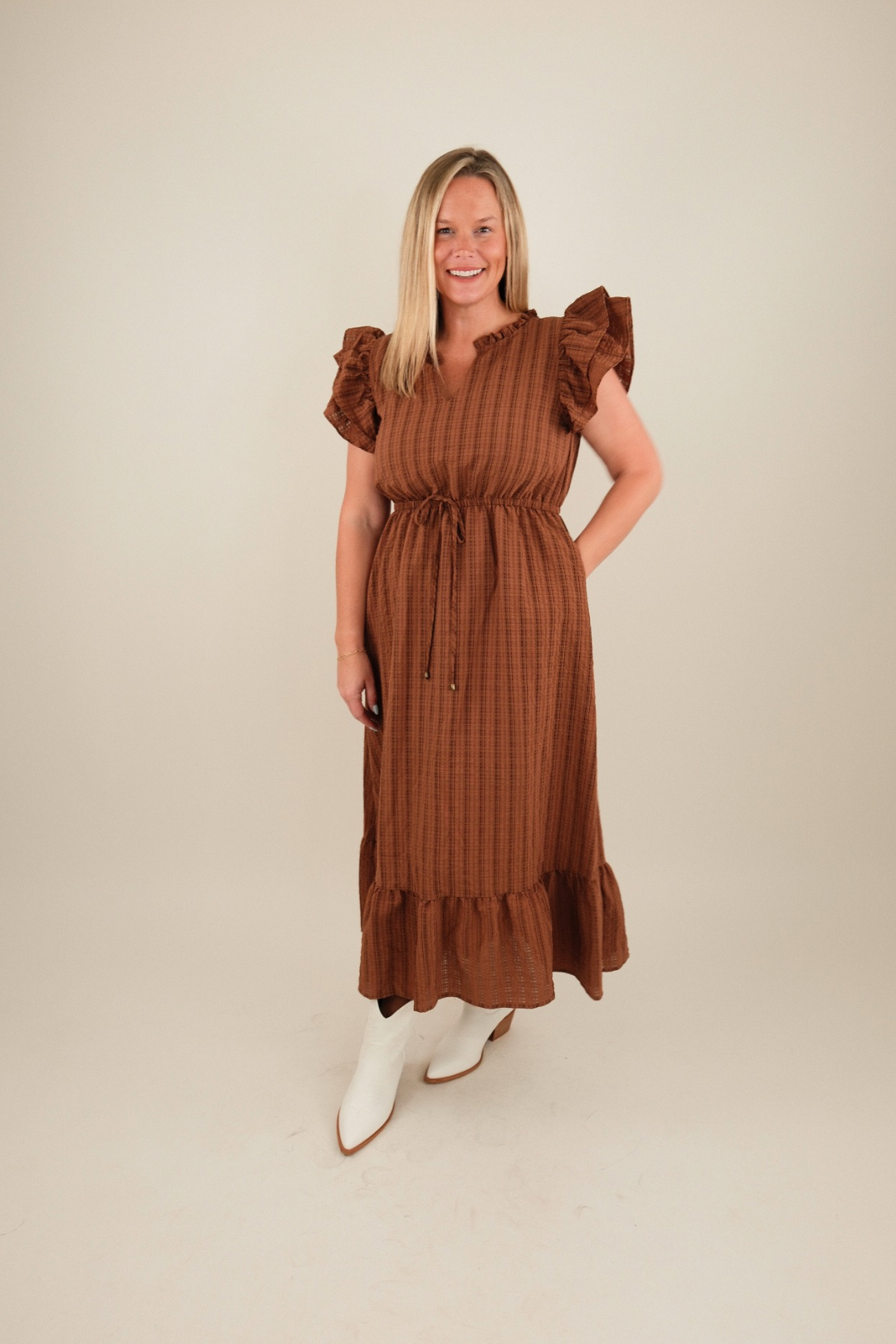 Channel timeless western charm in the Prairie Belle Plaid Midi Dress. Designed in a warm brown and black plaid, this dress features a flattering v-neckline framed with a delicate ruffle collar and sweet ruffled cap sleeves. Its midi length makes it perfect for pairing with boots, while the soft, flowy fit captures the spirit of prairie romance — ideal for rodeo dates, barn dances, or everyday cowgirl chic.