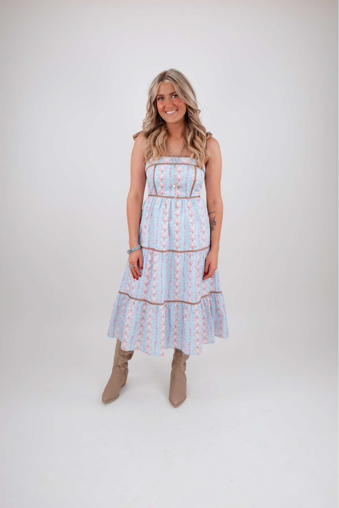 Feminine, romantic, and wildly western — the Prairie Bloom Maxi is a vision of delicate detail and soft beauty. This stunning baby blue dress is adorned with scattered light pink florals, creating a breezy floral landscape that feels both vintage and fresh. Designed with mocha satin shoulder ties that adjust for your perfect fit, this piece effortlessly blends grace with a subtle cowgirl edge.