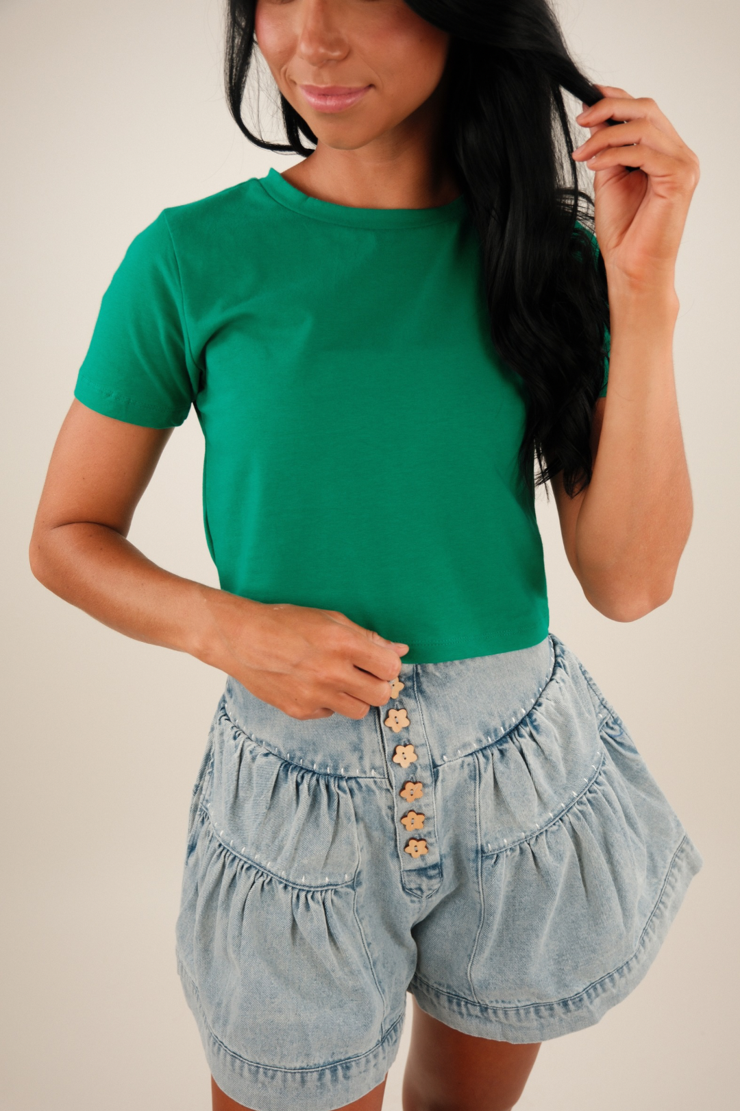 The Ranch Base Tee is the foundation every western wardrobe needs. This cropped, fitted cotton tee features a classic round neckline and flattering short sleeves—offering the perfect balance between laid-back and polished. Designed in a solid color for maximum versatility, it’s ideal for layering under denim jackets, vests, or flannels, or just worn solo for an effortlessly clean look.