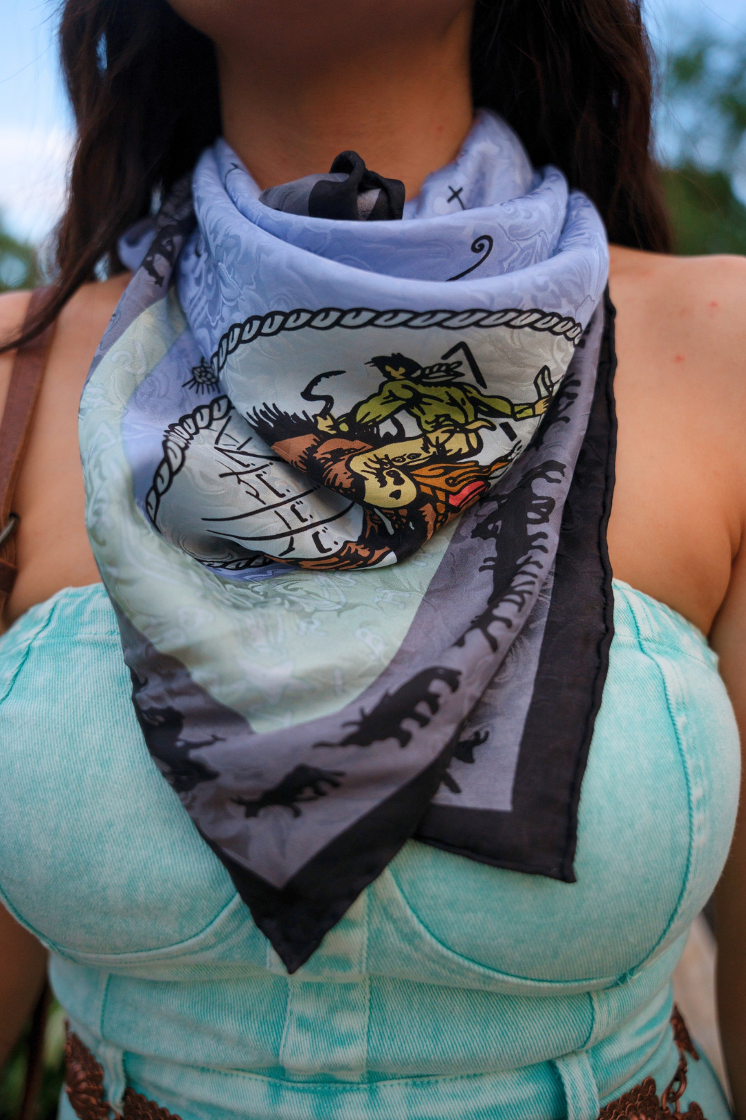 Set in a one-of-a-kind palette of periwinkle, sage green, grey, and black, this scarf brings softness and boldness together in perfect balance. Crafted from 100% silk, it drapes effortlessly and styles beautifully for rodeo days, evening outings, or everyday western wear.