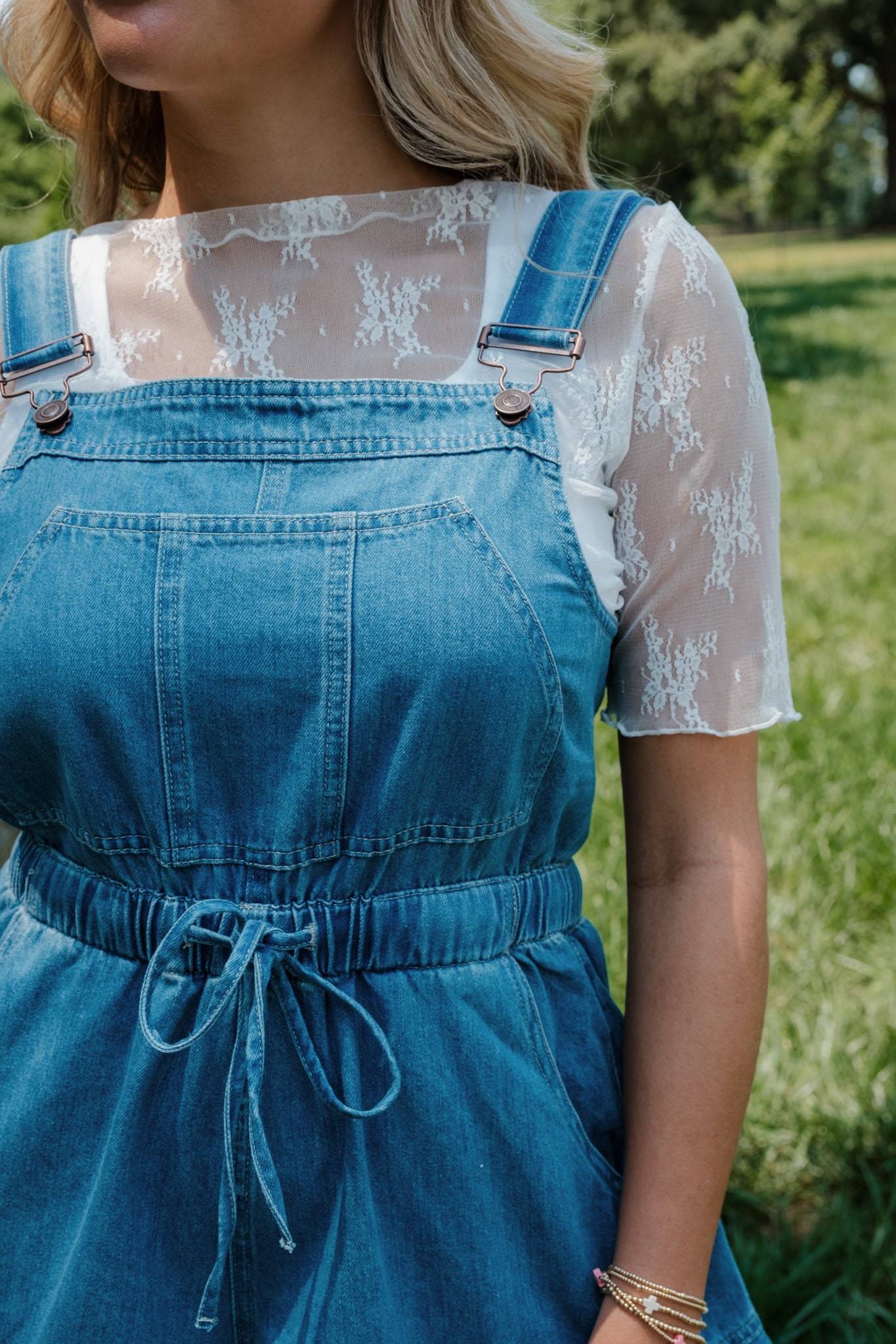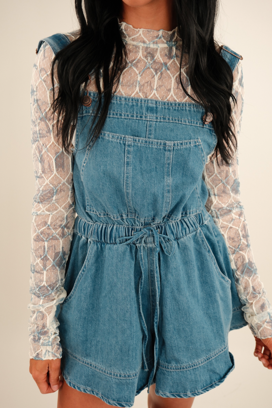 Crafted from soft, breathable denim, these shortalls feature a ruffled hem for a sweet and sassy touch, while the cinched elastic waistband keeps the fit flattering and easy to wear. The open back with two bow-tied straps adds that extra wow factor—made to show off your festive flair.