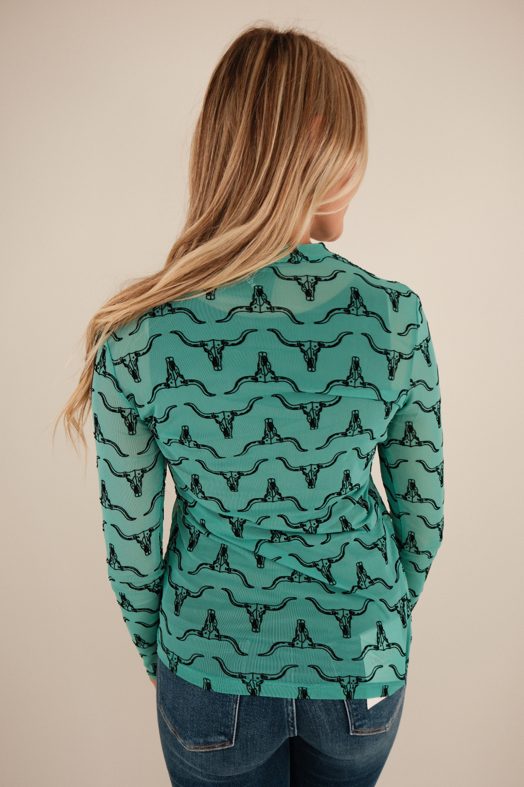 Bold, edgy, and undeniably western, the Regal Rodeo Mesh Top is a true showstopper. This stunning turquoise long-sleeve top features 3D black velvet cow skull designs, creating a striking contrast that captures the spirit of the West. The sheer mesh fabric adds a modern, sultry edge, making it the perfect statement piece for layering over a bralette or tank.