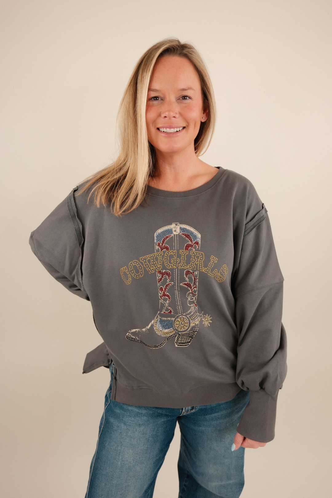 The Rhinestone Cowgirl Sweatshirt brings western flair and cozy comfort together in one standout piece. Designed in a slouchy oversized fit with drop shoulders, this sweatshirt features a bold front graphic — a sparkling bedazzled cowboy boot with the word “Cowgirl” emblazoned across the top.