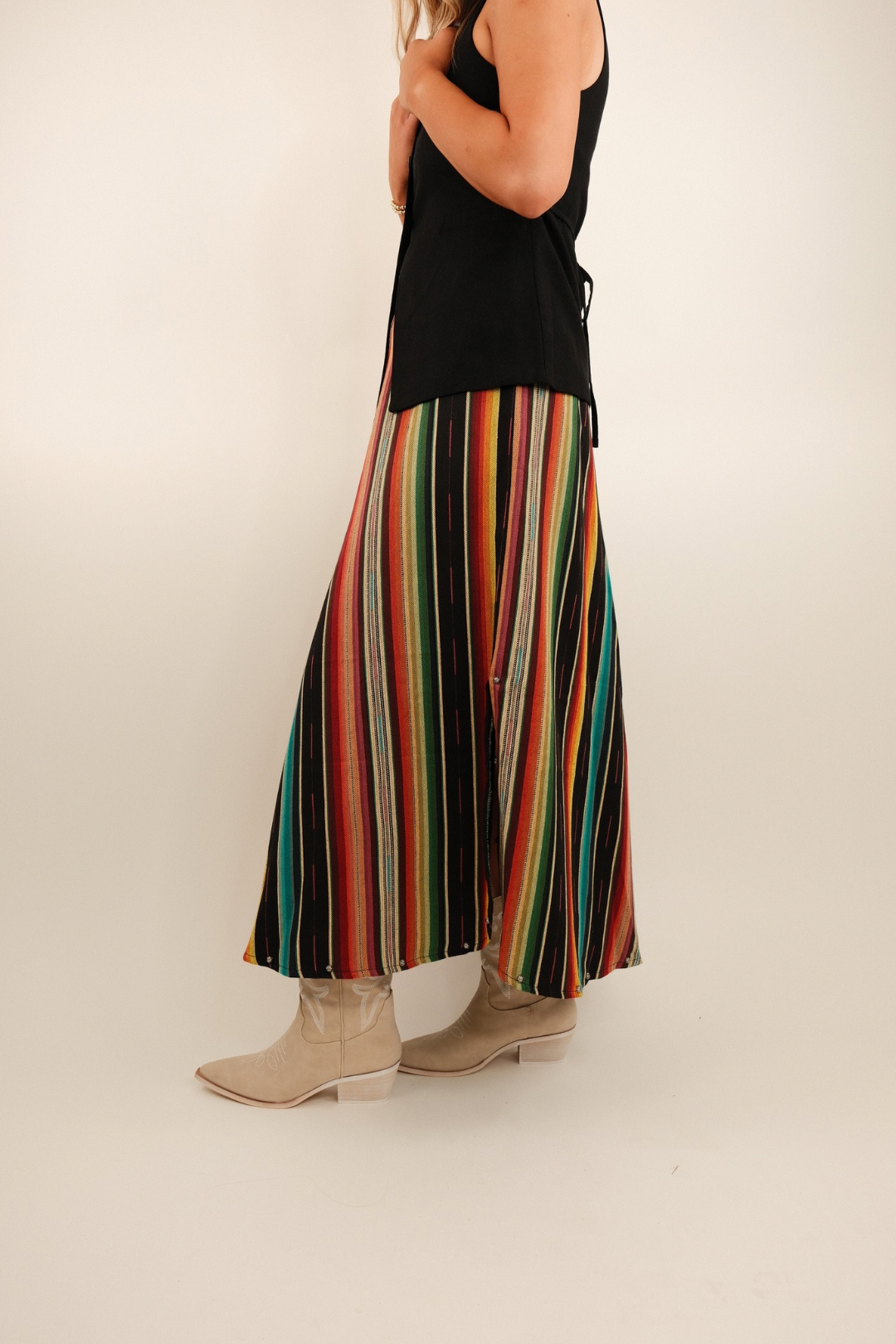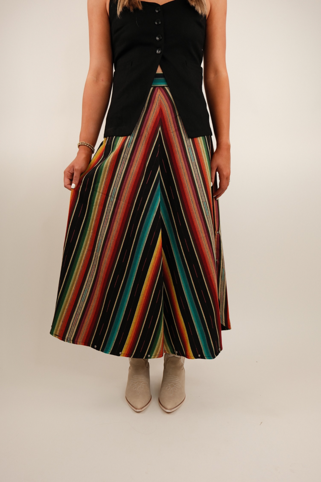 The black base is brought to life with vibrant stripes that celebrate Texas style, while brushed silver studs along the hem add a touch of rodeo edge. Designed for the modern cowgirl with a taste for high-end craftsmanship, this skirt is as durable as it is striking — perfect for concerts, festivals, or western nights when you want to make an unforgettable statement.