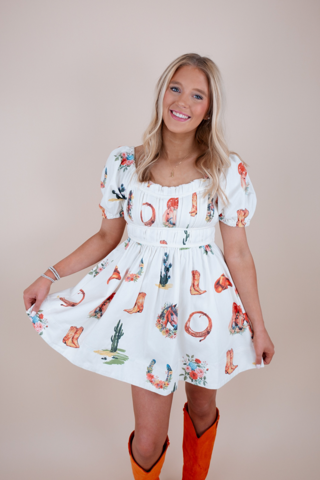 The Rodeo Romance Mini Dress is a sweet and sassy statement piece made for true western hearts. Crafted from crisp white denim, this mini dress features an allover western-themed print that includes cowboy boots, rope, cacti, and an adorable horse couple—a playful nod to prairie love stories and open-range adventures.