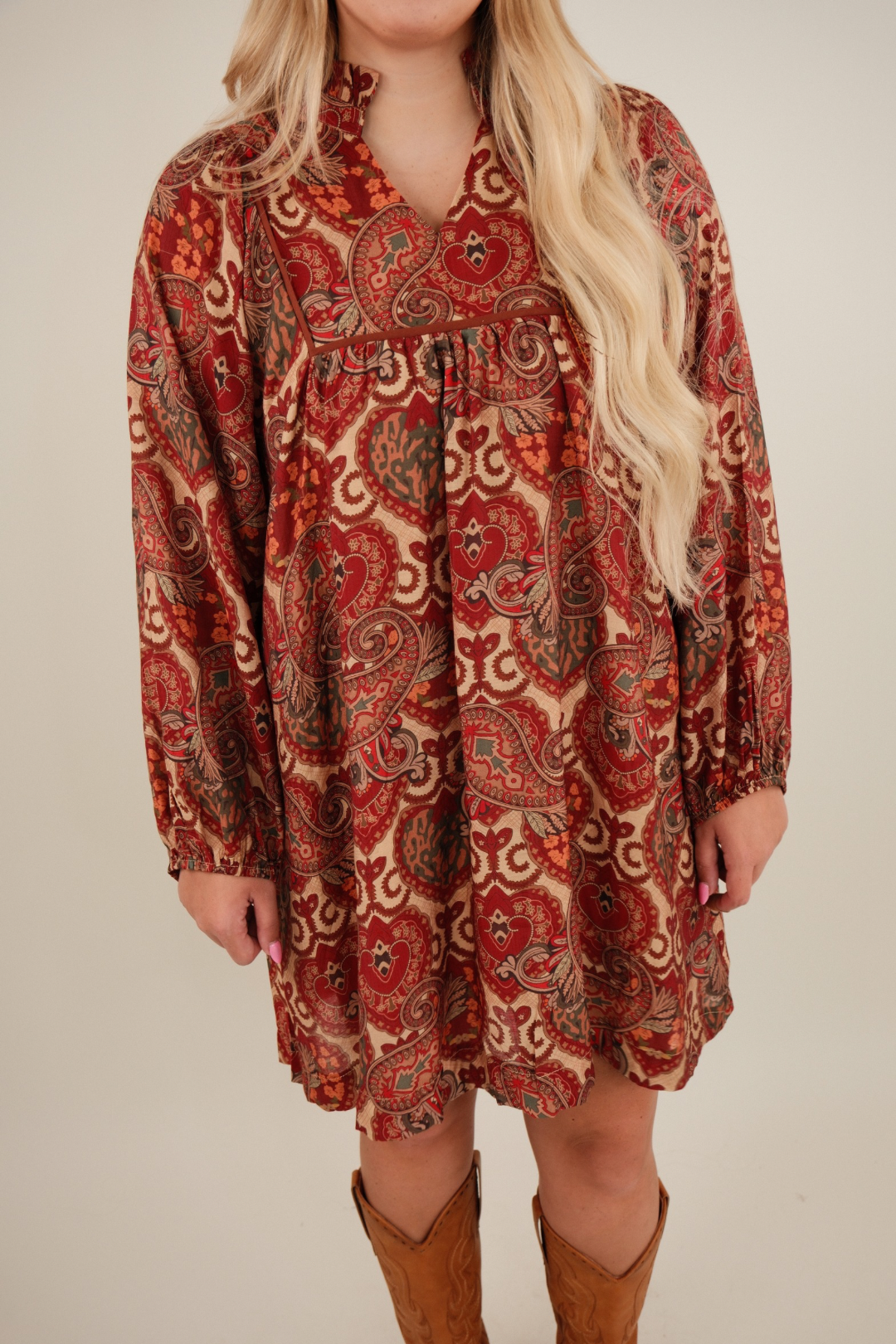 Step into effortless Western charm with our Rodeo Romance Paisley Mini Dress. This fully lined dress combines a feminine silhouette with bold, rustic elegance. The V-neckline is framed by a playful ruffle collar, while contrast piping highlights the intricate red and brown paisley floral print. Long sleeves with elastic wrists add a touch of comfort and volume, making this the perfect piece for everything from rodeo date nights to seasonal festivals.
