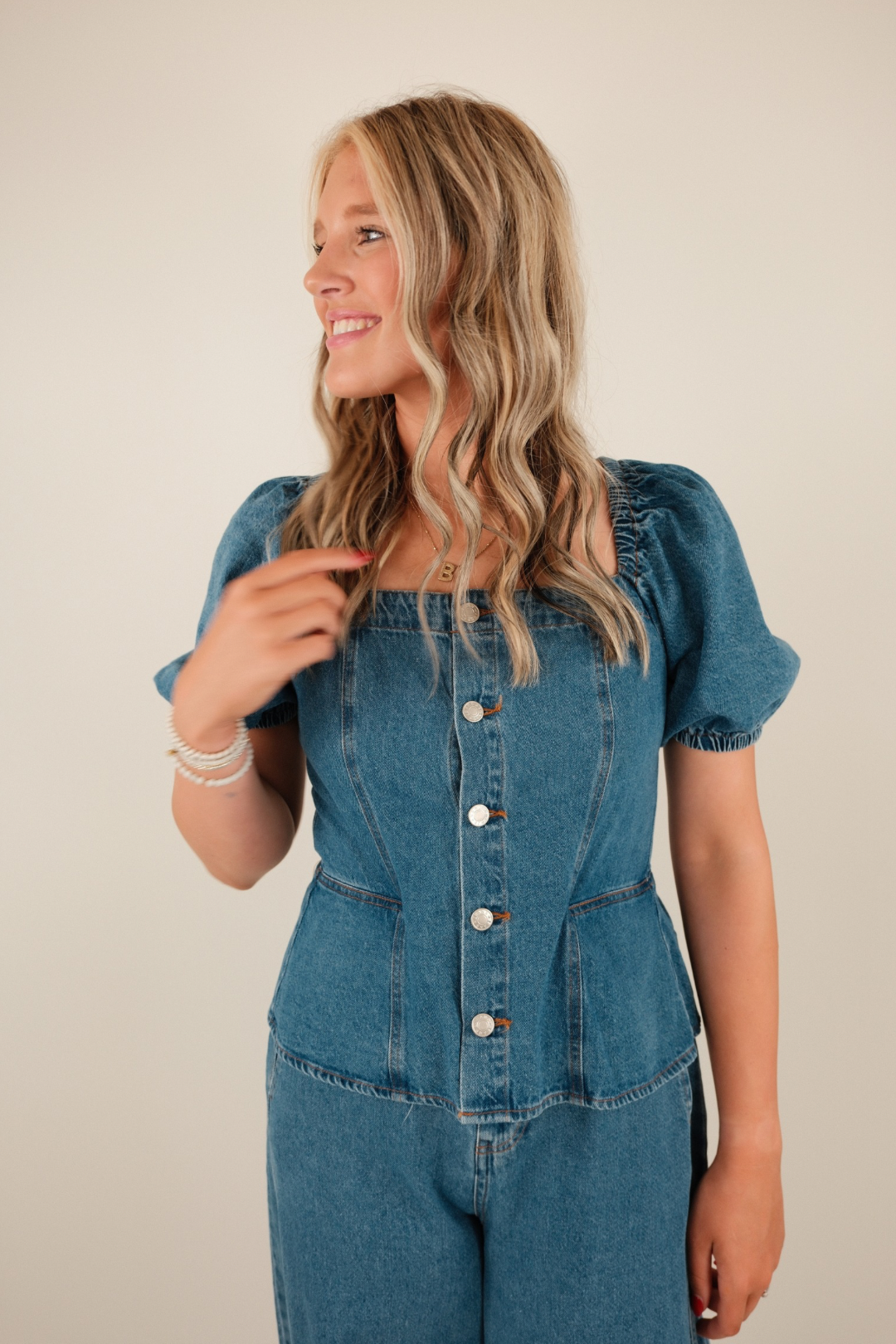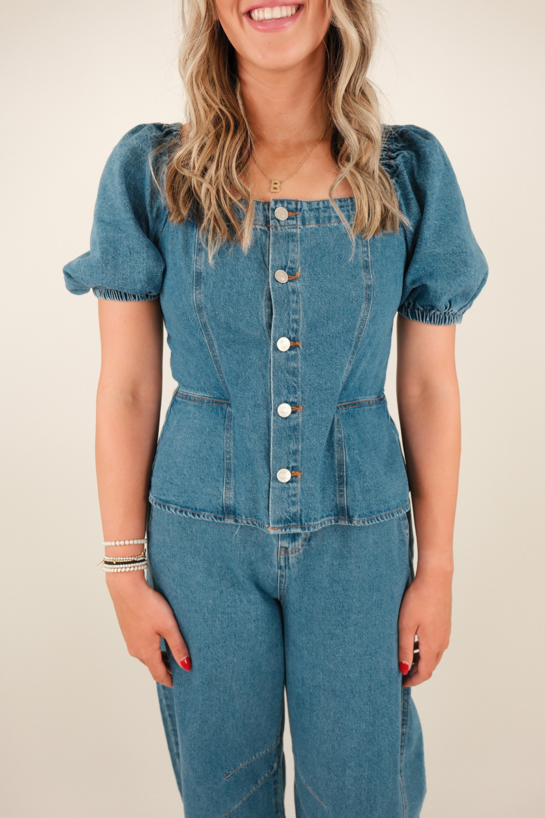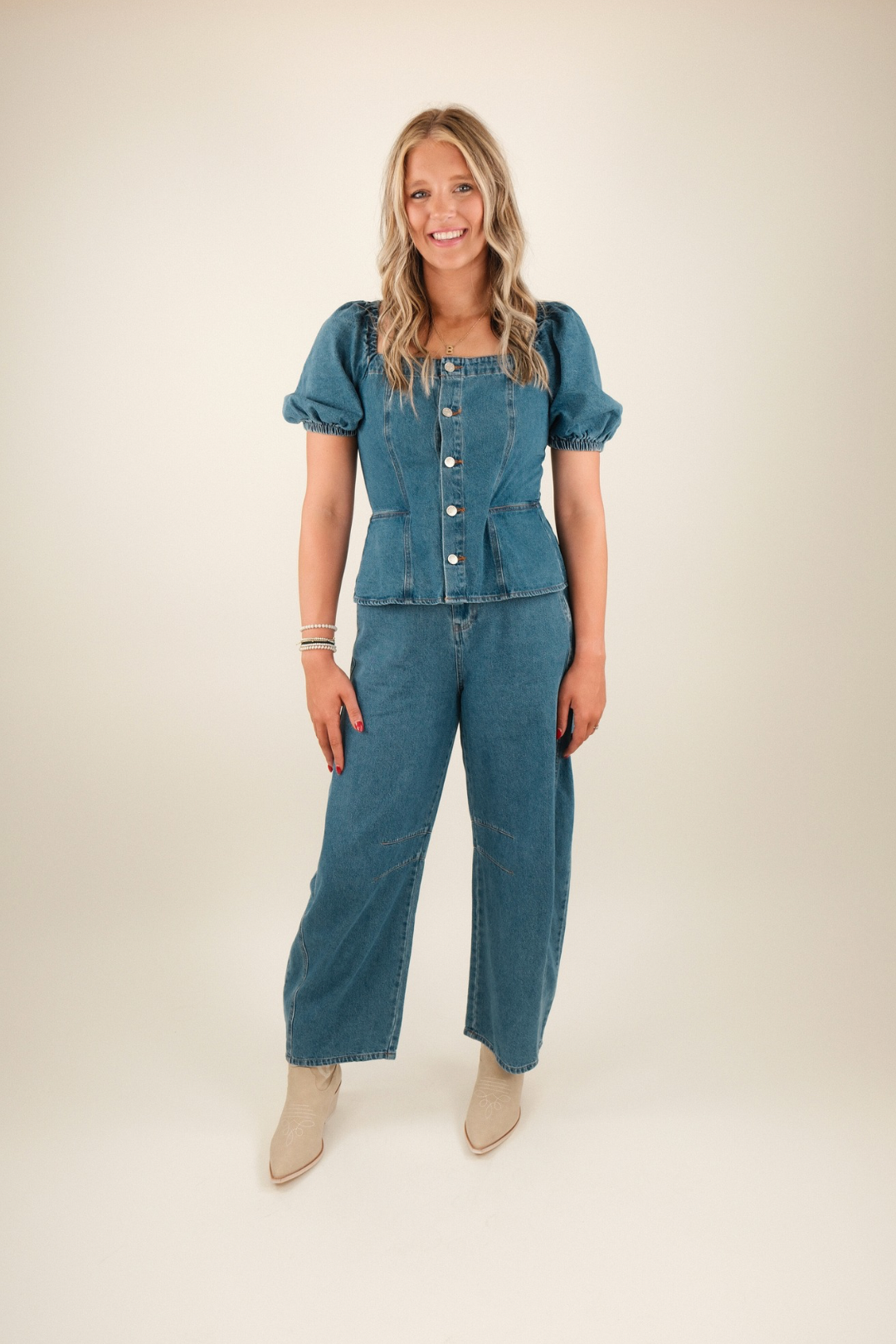 Wrangle up your wild side with the Rodeo Ruffle Denim Jumpsuit — a one-piece wonder that blends fierce frontier fashion with flirty feminine charm. Crafted from sturdy yet soft denim, this show-stopping jumpsuit features voluminous puff short sleeves and a standout peplum ruffle at the waist for a flattering silhouette with extra sass.