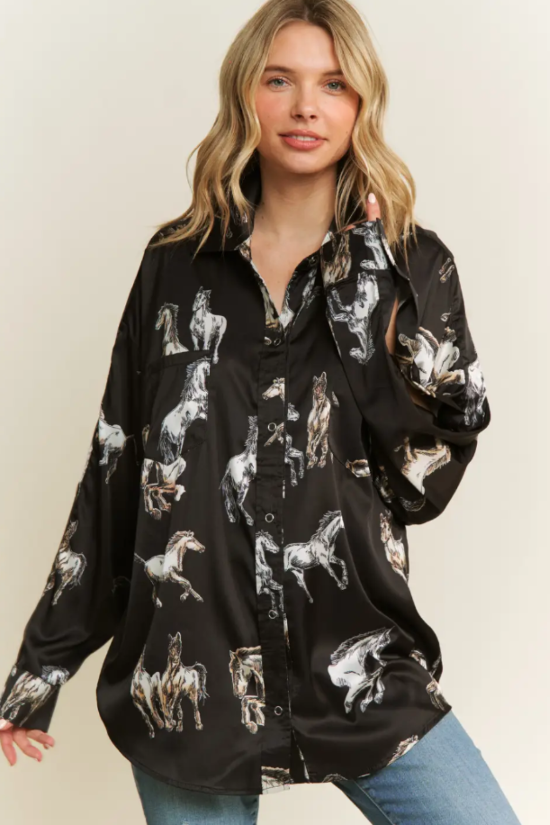 This long sleeve satin blouse features a fluid, loose-fitting silhouette that drapes beautifully for a polished yet effortless look. The galloping horse print gives it dynamic movement and western flair, while details like pearl snap closures, collared neckline, and dual chest pockets keep it timeless. Snap accents trail down the top of each sleeve, adding a subtle edge that sets this blouse apart.