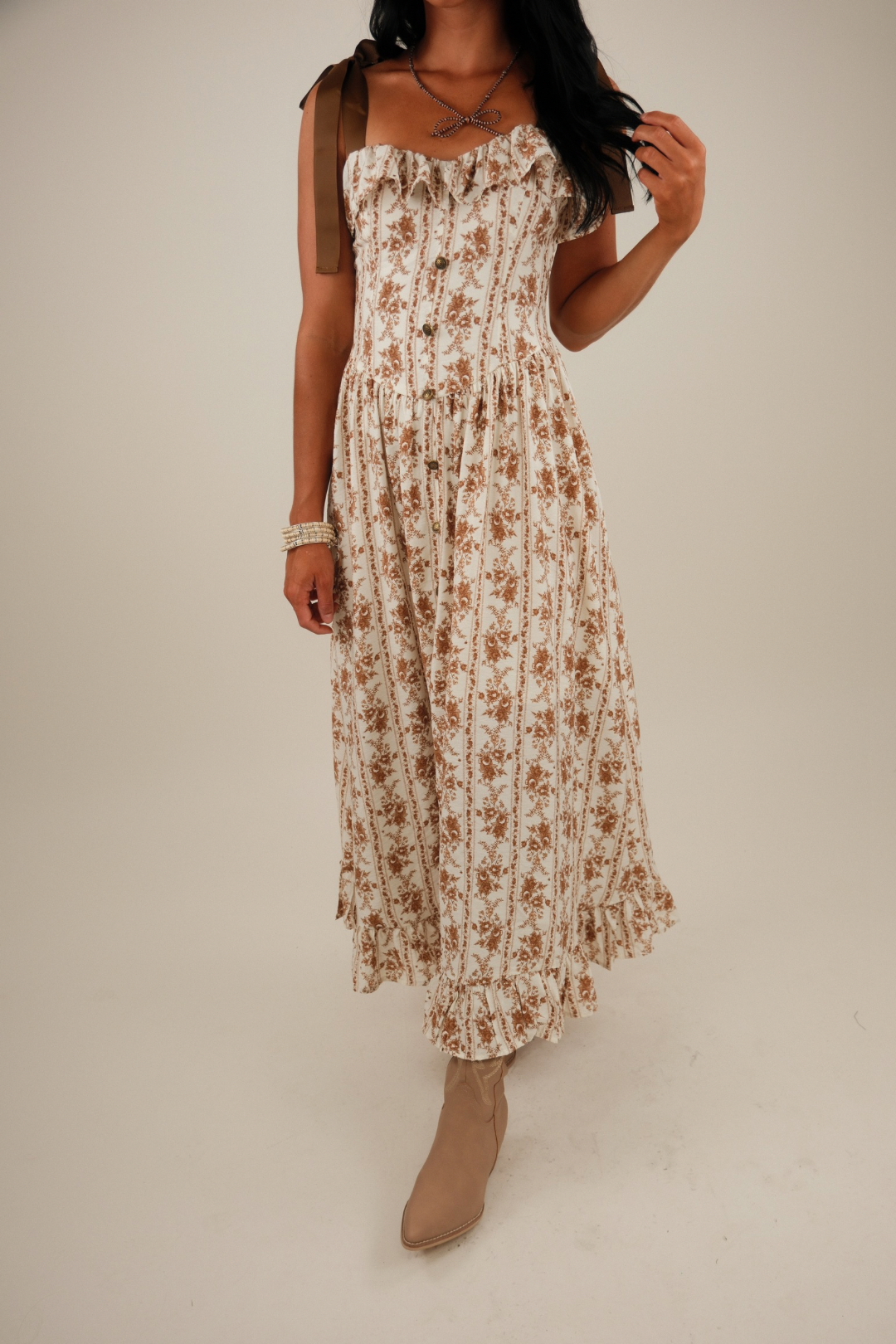 Soft prairie romance meets classic western charm in the Saddle Rose Ribbon Dress. This cream beauty is adorned with delicate vertical floral stripes in a warm brown hue, creating a flattering and timeless silhouette. A soft ruffle dances across the neckline for that extra feminine touch, while bronze decorative buttons trail down the center front, echoing vintage cowgirl vibes.