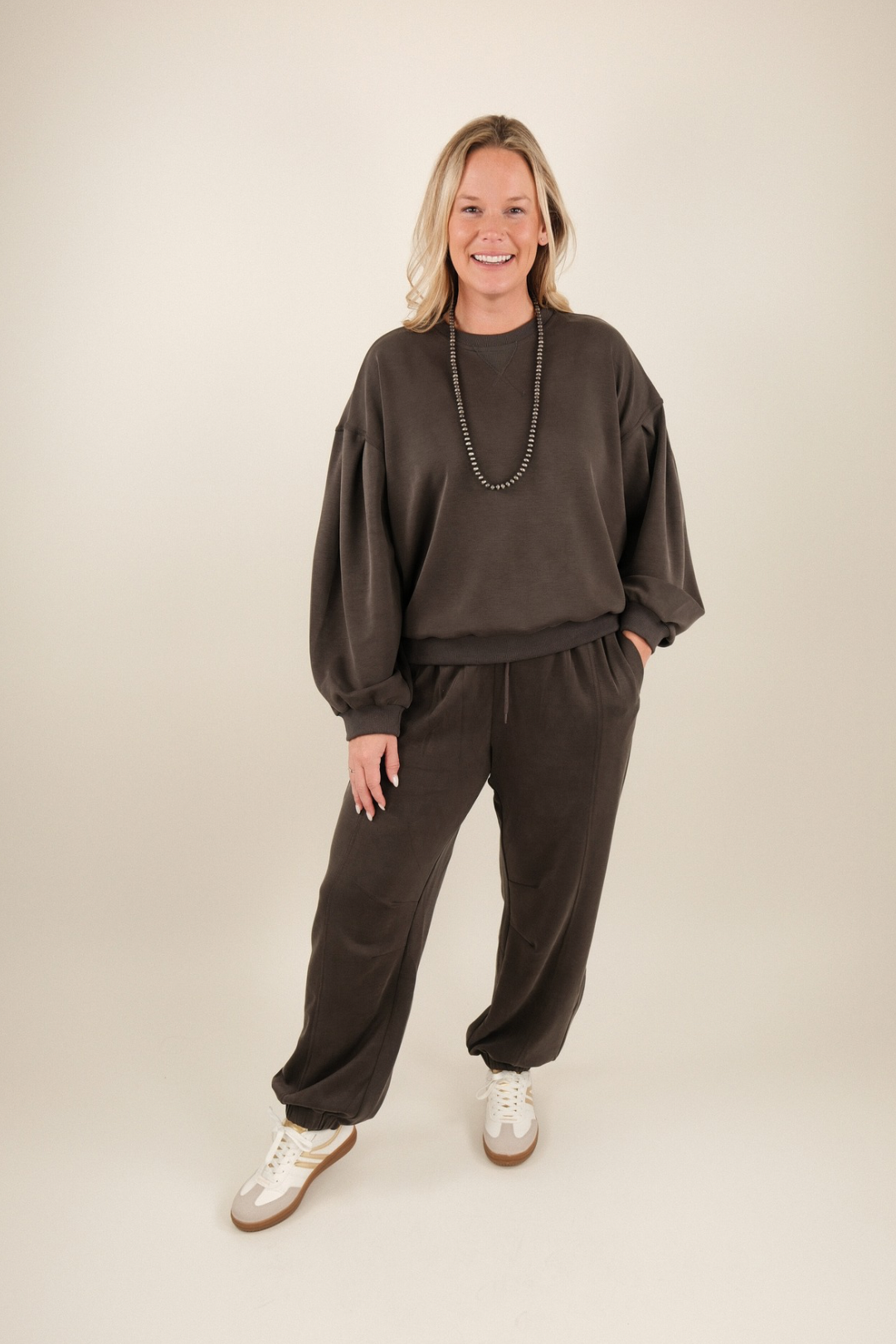 Crafted from an unbelievably buttery soft fabric, this two-piece set features a relaxed pullover top with subtle pleating details at the sleeves for a feminine touch. The matching joggers boast a high-waisted elastic waistband with drawstring, front and back seam accents, and tapered legs with an elastic cuff—making them perfect for styling with your favorite boots or casual sneakers.