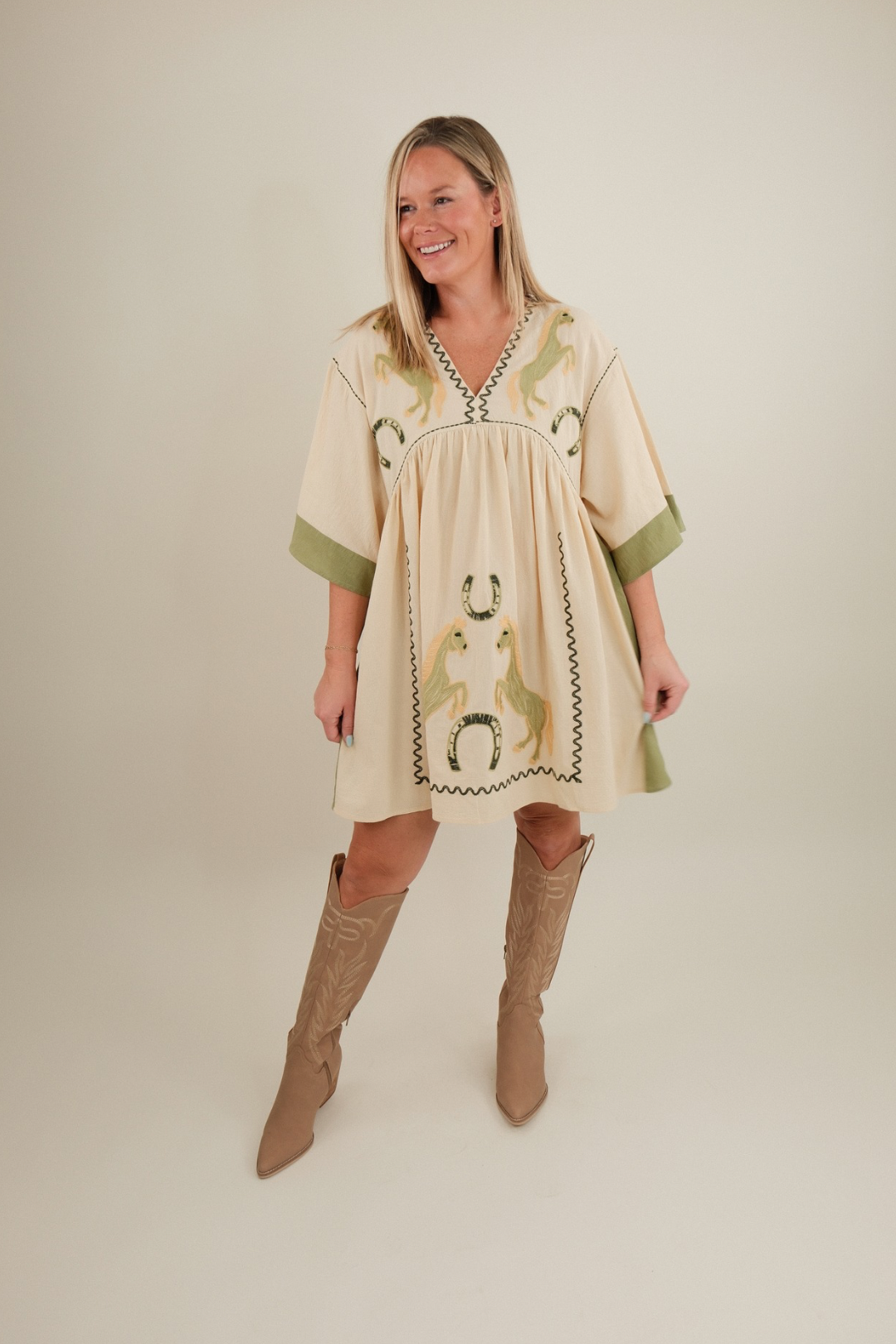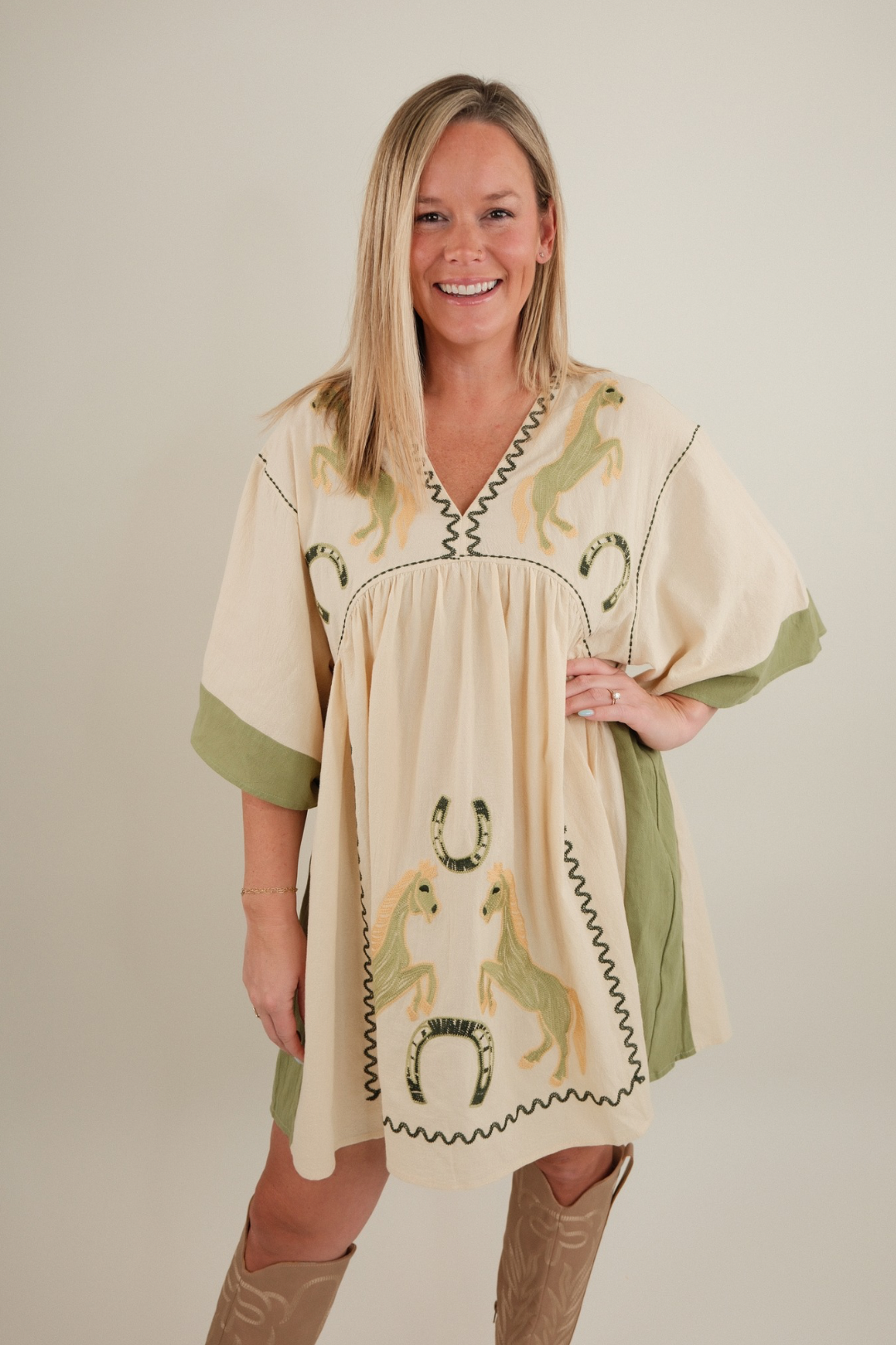 Breezy, bold, and beautifully western — the Saddle Song Embroidered Mini Dress is a true cowgirl classic. Crafted in a lightweight cream fabric, this oversized mini features denim-colored panels down the sides and around the flowing wing-style ¾ sleeves for a striking contrast that flatters every shape.