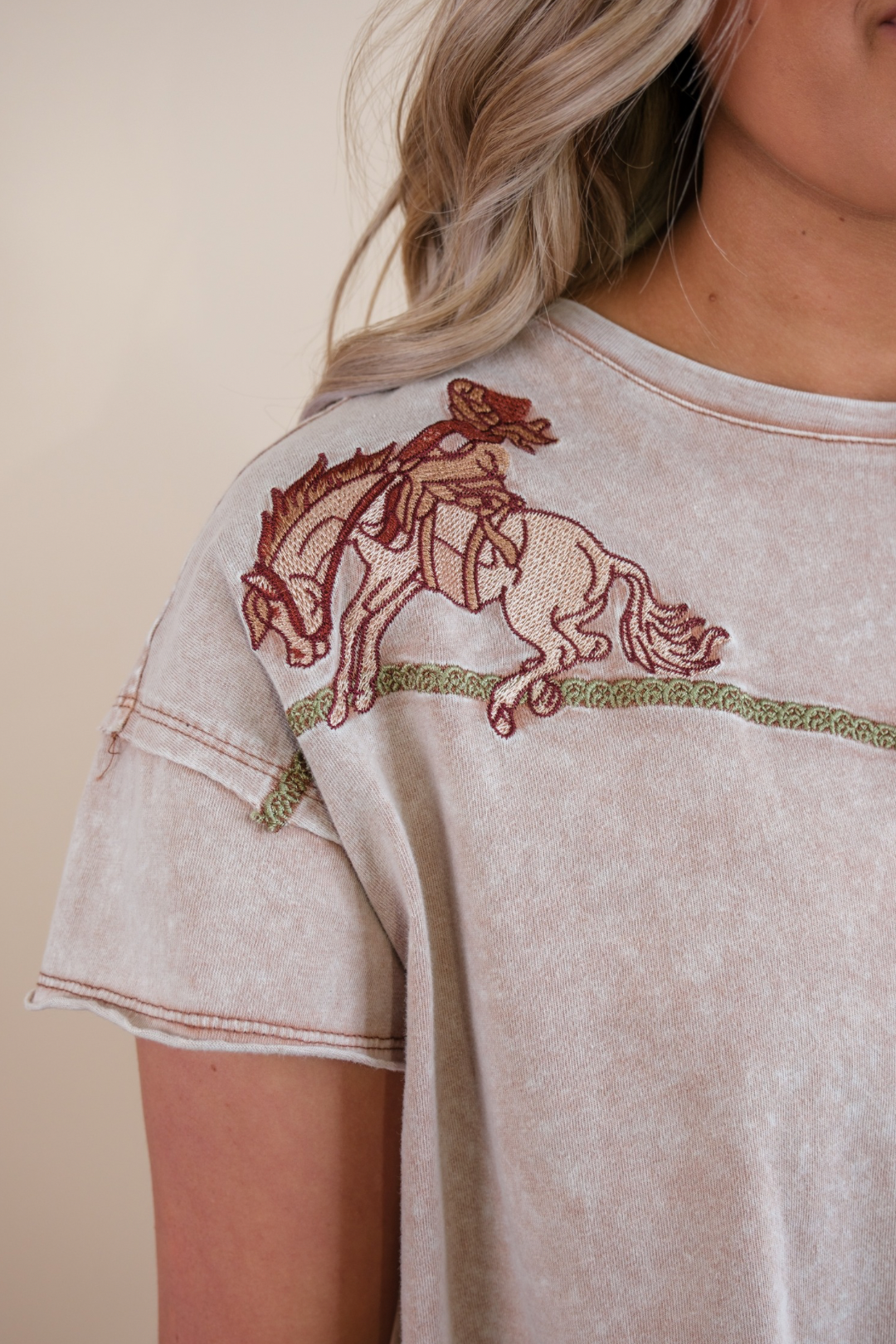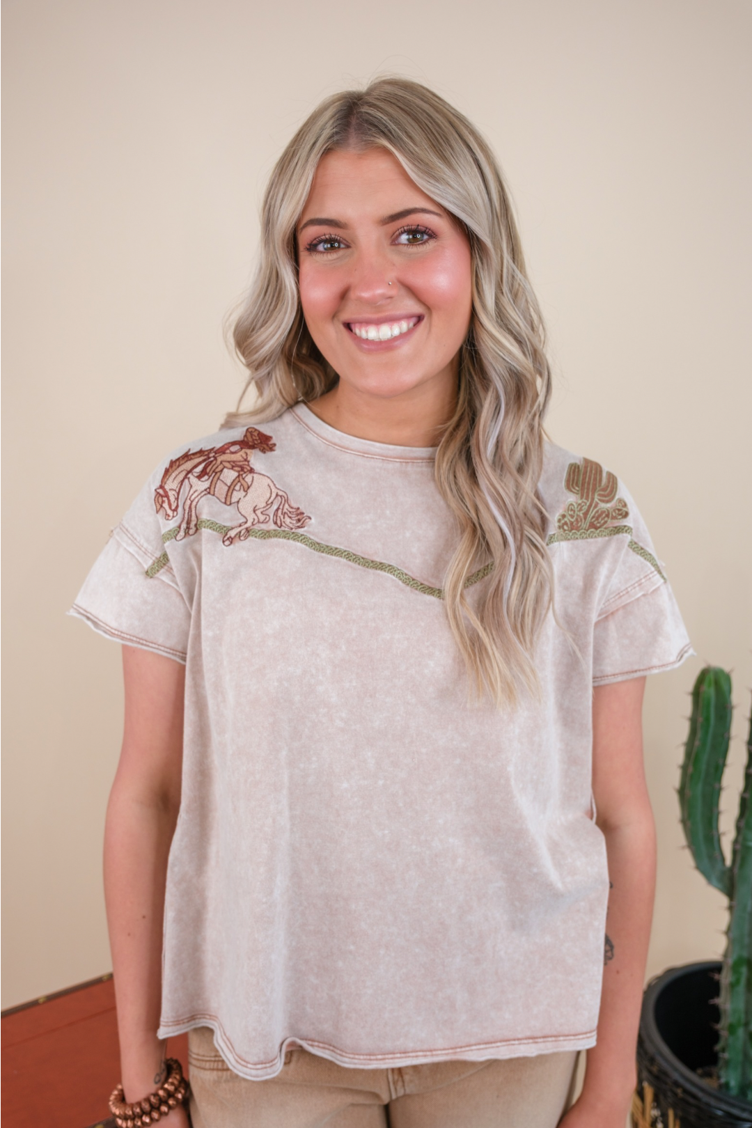 This Saddle Up Cowgirl Tee is a must-have for any Western-inspired wardrobe; with its mauve mineral wash background. Featuring a beautiful cowgirl on horseback graphic and intricate cactus stitching on the chest, it brings a touch of rustic charm to your everyday style. The stitching design across the top, in earthy tones of brown, green, tan, ivory, and rust, adds a unique, handcrafted feel to this basic tee. With short sleeves, a high-low hemline, and unfinished hemlines for added detail, this tee offers both comfort and distinctive style for the modern cowgirl.