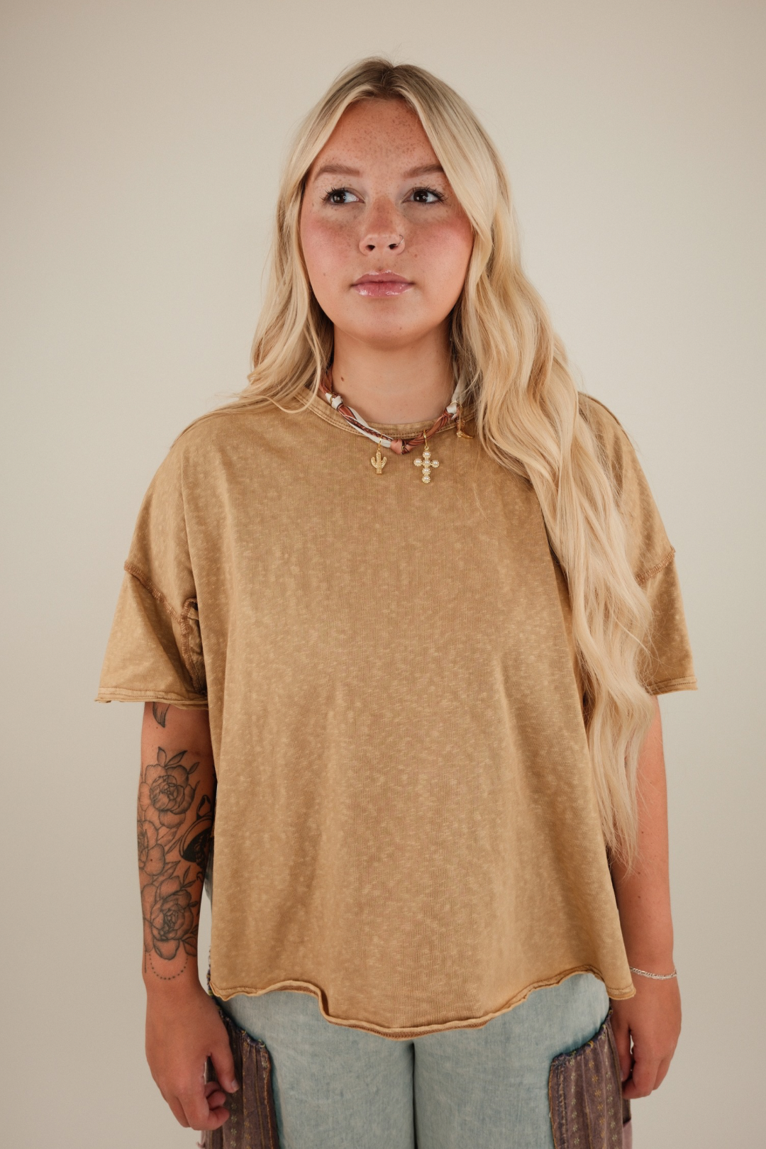 Rugged meets refined in the Sagebrush Canyon Mineral Tee — your new favorite everyday top with a touch of western edge. Crafted in a soft mineral-washed fabric, this tee features raw hems and an artful curved seam that starts at the waist and sweeps upward beneath the sleeve, adding unexpected shape and structure.
