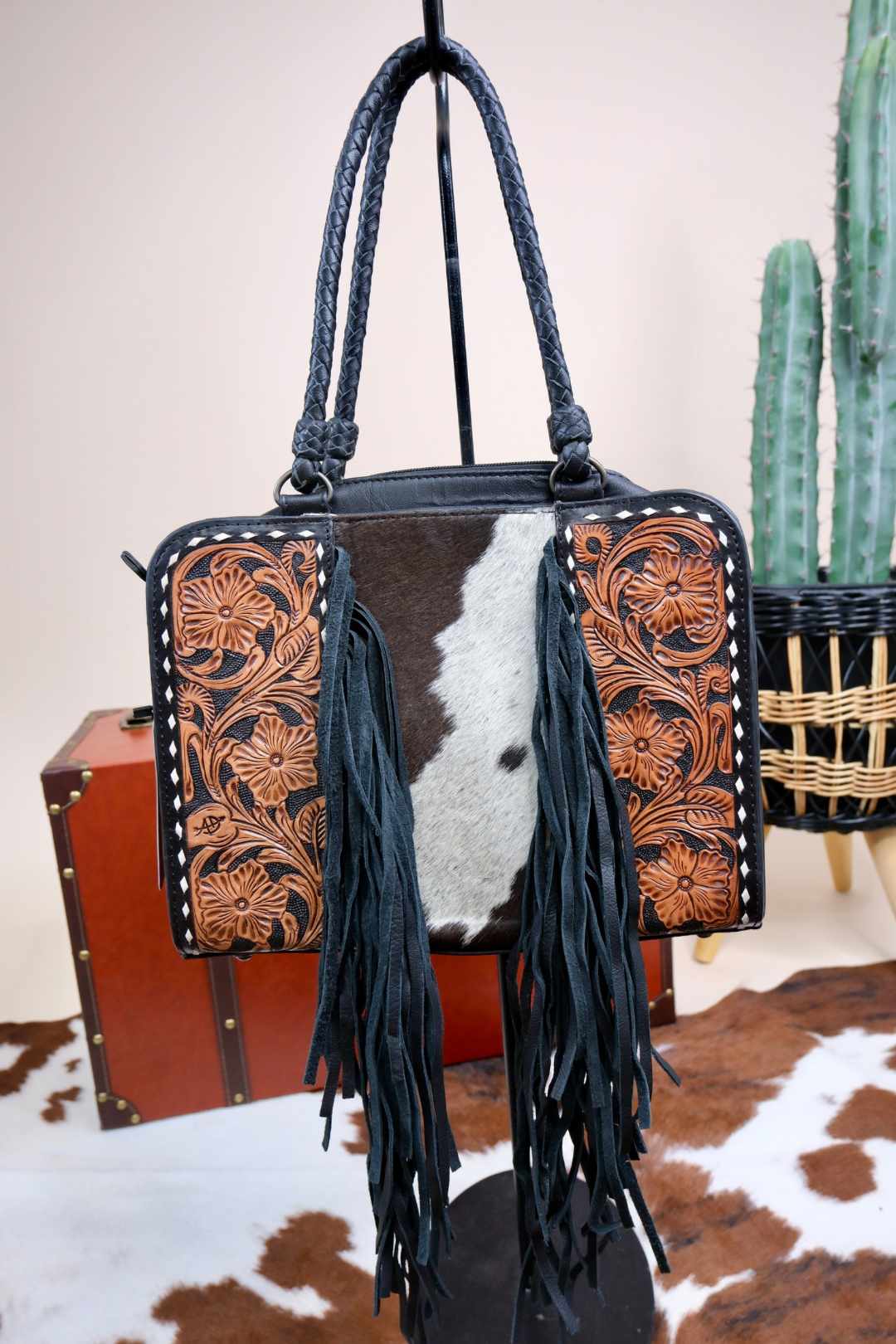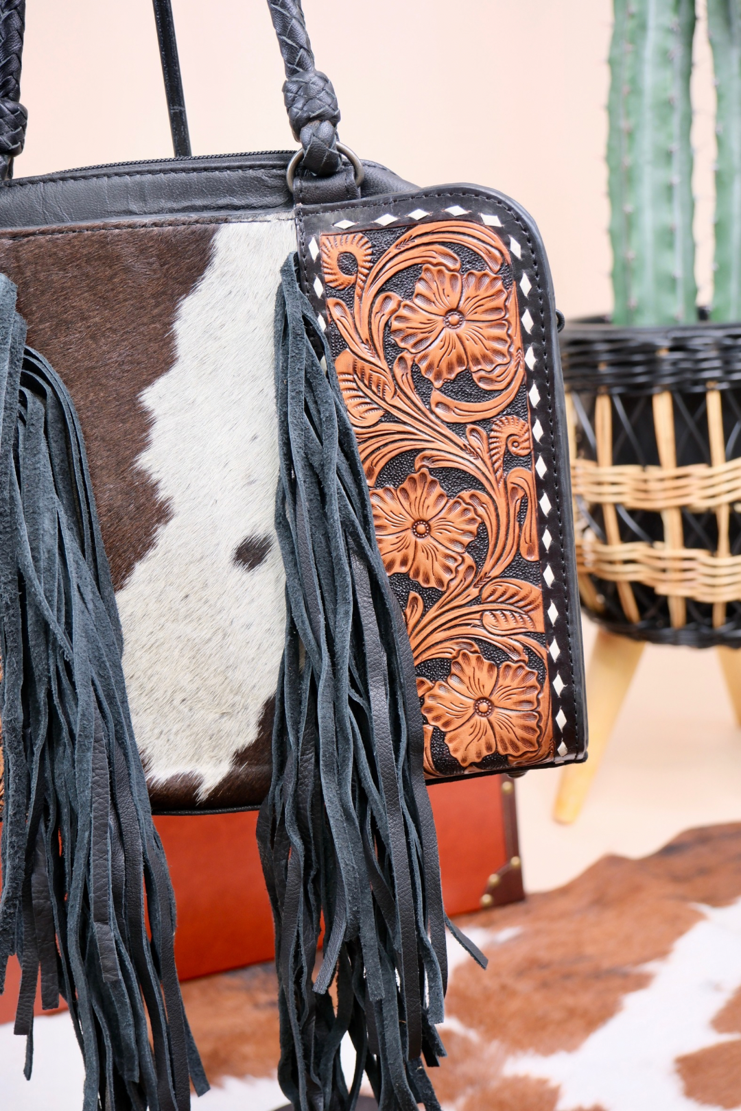 Finished with an adjustable leather strap and antiqued metal hardware, this bag is equal parts utility and artistry—perfect for cowgirls who carry themselves (and more) with power and grace.