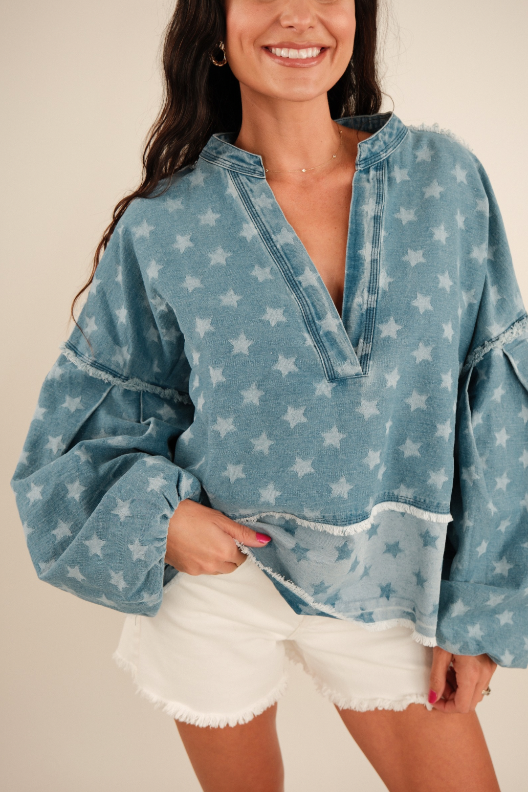 Shine bright under western skies in the Shooting Start Denim Blouse, a show-stopping top made for the cowgirl who loves to stand out. This statement blouse features a soft, boxy oversized fit that blends comfort with effortless charm. The two-tone denim star appliqués scattered throughout the top bring a playful, patriotic edge with a classic western feel.