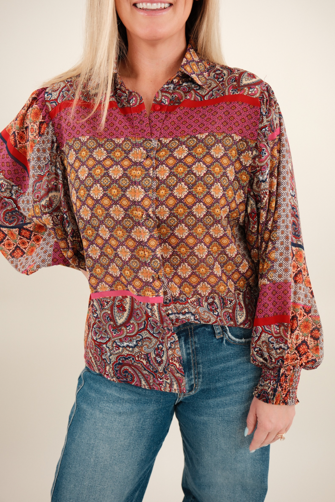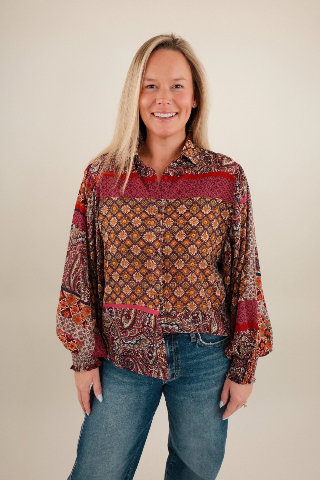 The Sierra Sunset Patchwork Blouse is all about color, movement, and western-chic flair. Crafted from airy chiffon, this button-down blouse features a vibrant mix of red, navy, fuchsia, orange, and green in bold patchwork patterns. Long puff sleeves add volume and drama, while the collared neckline keeps it polished and versatile.
