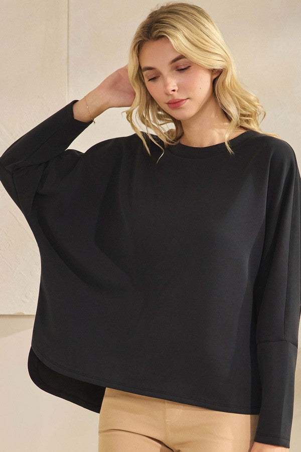 The top features a crew neckline, extended dolman sleeves, and a flattering high-low curved hem—perfect for tucking or flowing freely. The matching wide-leg pants offer an elongating shape with an elasticized waist and side pockets, giving you ease, comfort, and quiet sophistication in one chic set. Whether you're running errands, lounging in style, or heading out for a casual day trip, this set delivers elevated comfort with a touch of western-inspired ease.