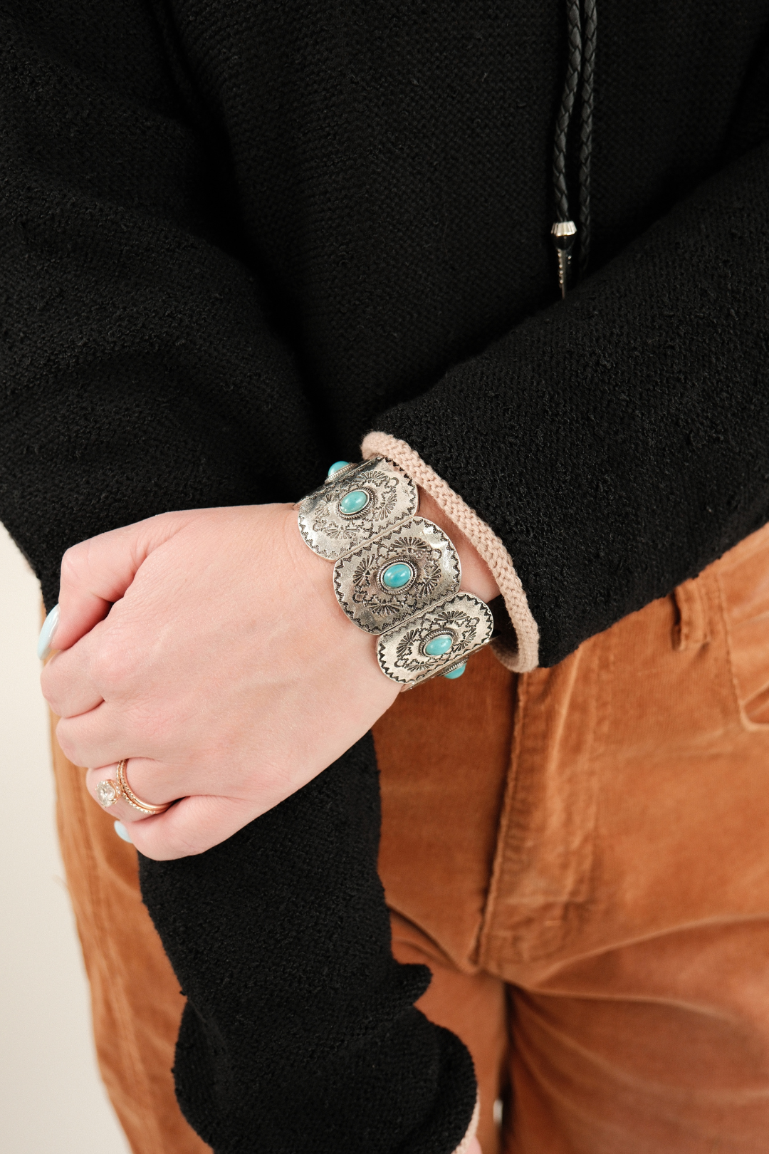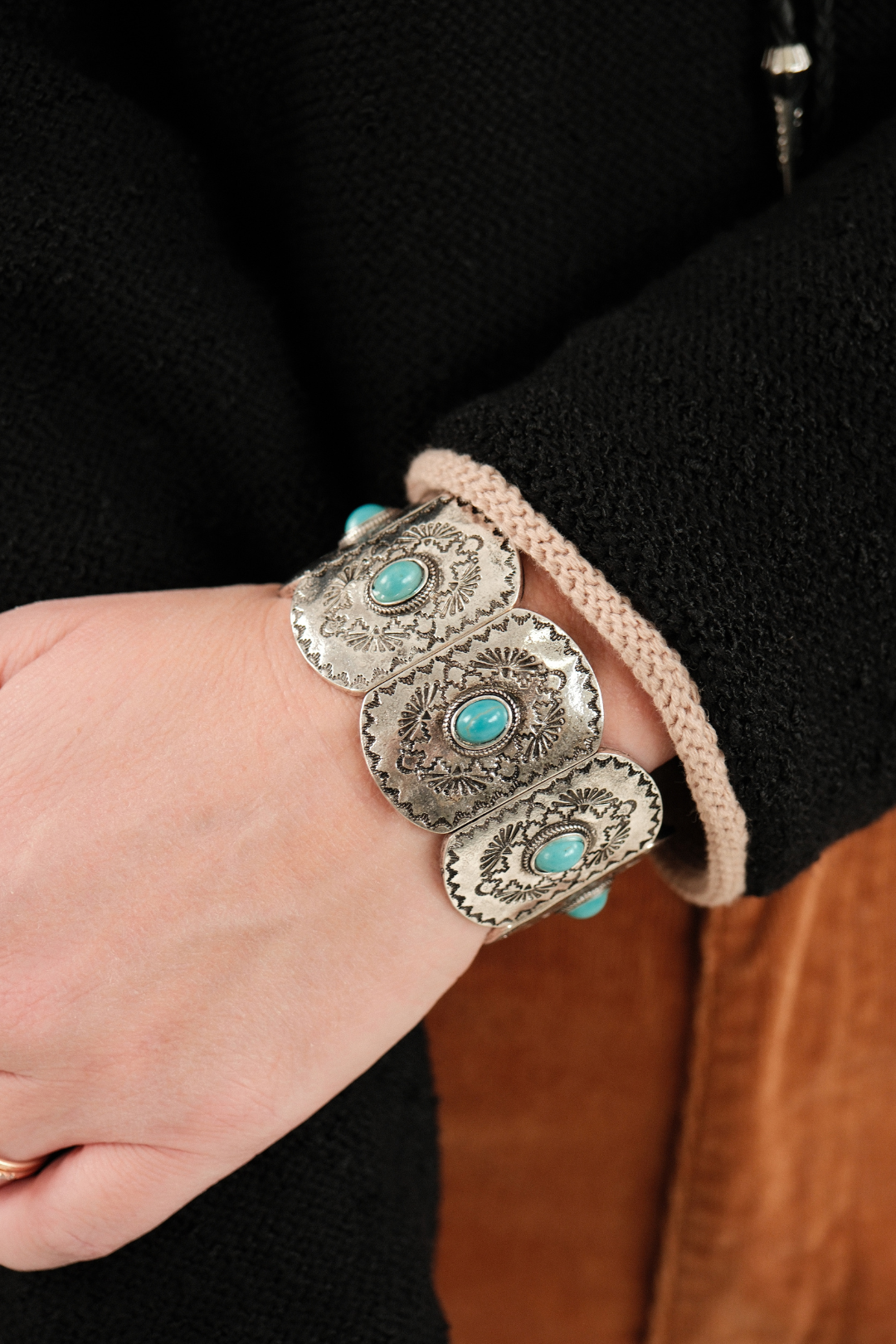 Add a touch of western elegance to your look with the Silver Mesa Turquoise Stretch Bangle. Designed for effortless wear, this lightweight bracelet features shimmering silver-tone sections accented with small turquoise stones that capture the spirit of the desert sky. Its stretch-fit design ensures comfort and versatility, making it the perfect everyday accessory for cowgirls who love a little sparkle with their saddle.