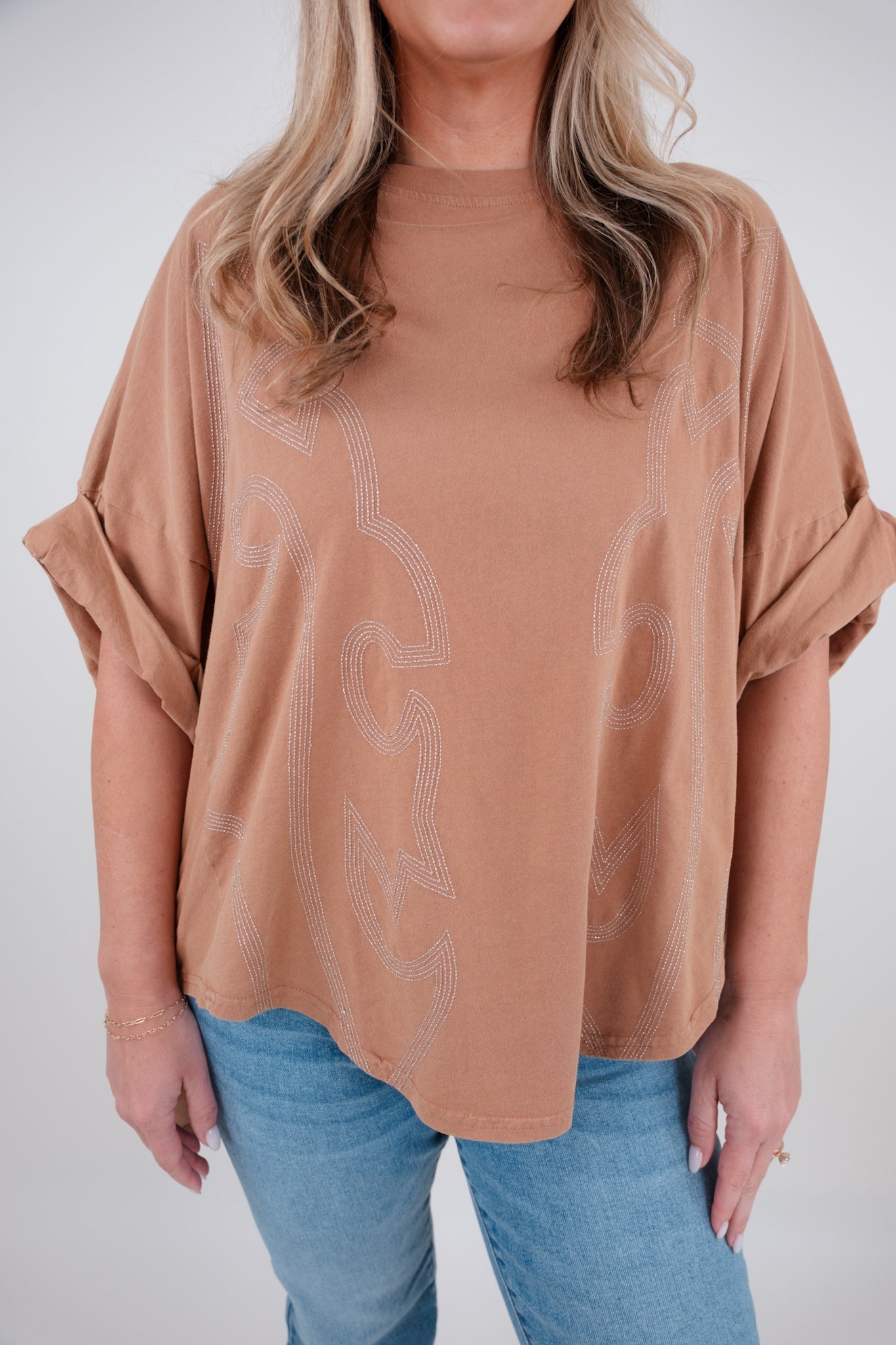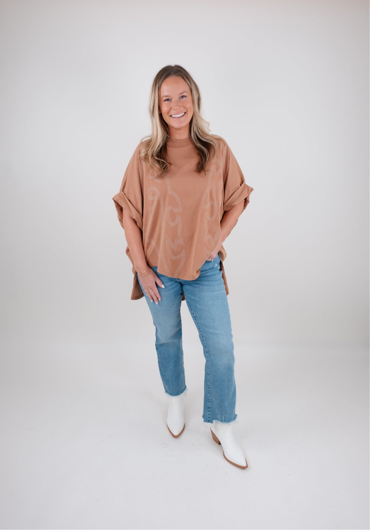Part of our exclusive Boot Stitch Collection, the Silver Spur Tunic is the definition of effortless western charm. Designed with an oversized silhouette and rolled sleeves, this relaxed-fit top blends comfort with cowgirl edge. Soft, stretchy fabric makes it easy to wear all day, while the high-low hemline adds movement and a flattering shape.