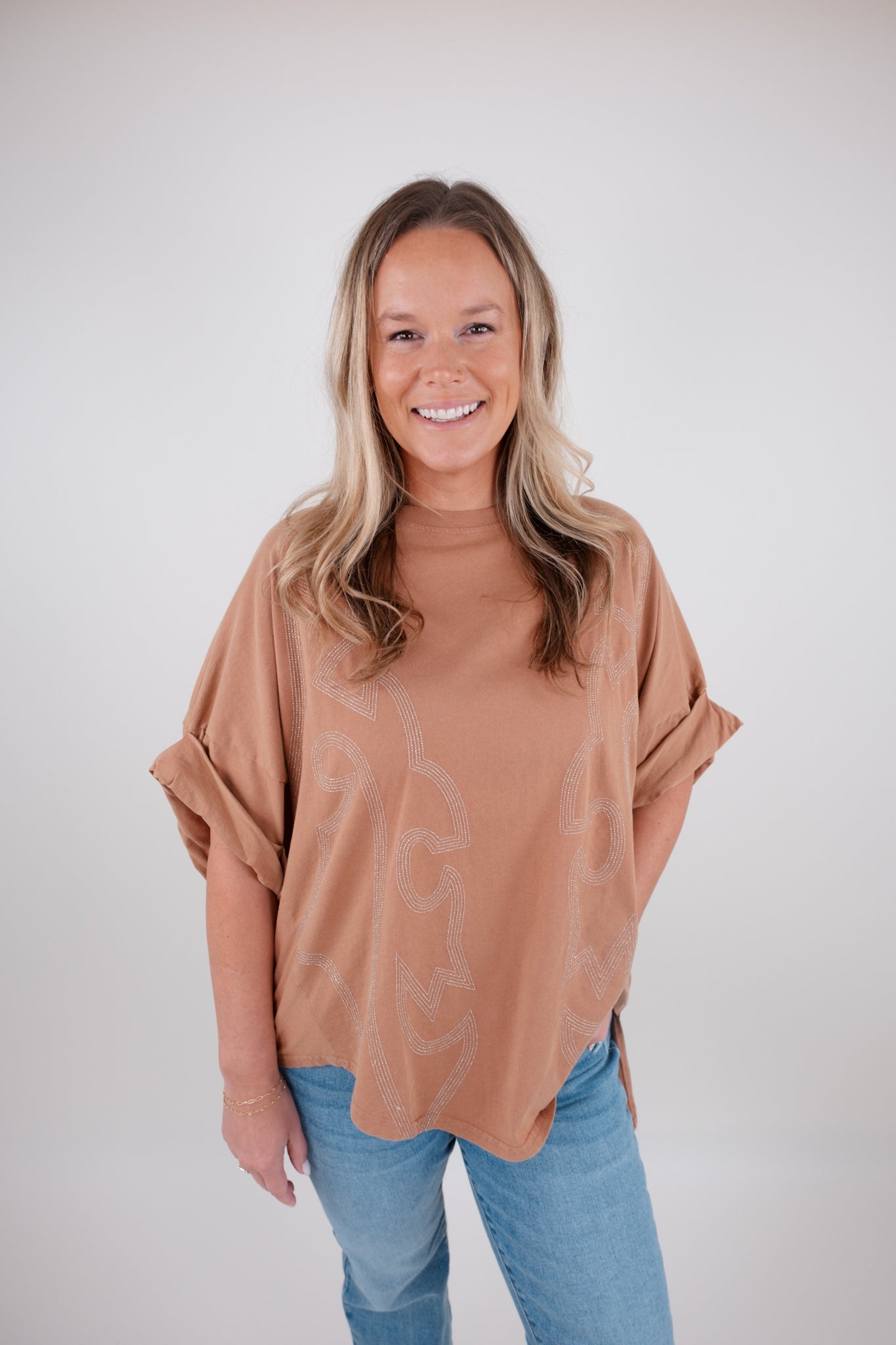 What makes this tunic a standout? The eye-catching silver embroidered boot stitch design on each side—an ode to classic western styling reimagined for everyday wear. Whether you pair it with denim or layer it over leggings, this tunic adds a bold yet feminine statement to your wardrobe.