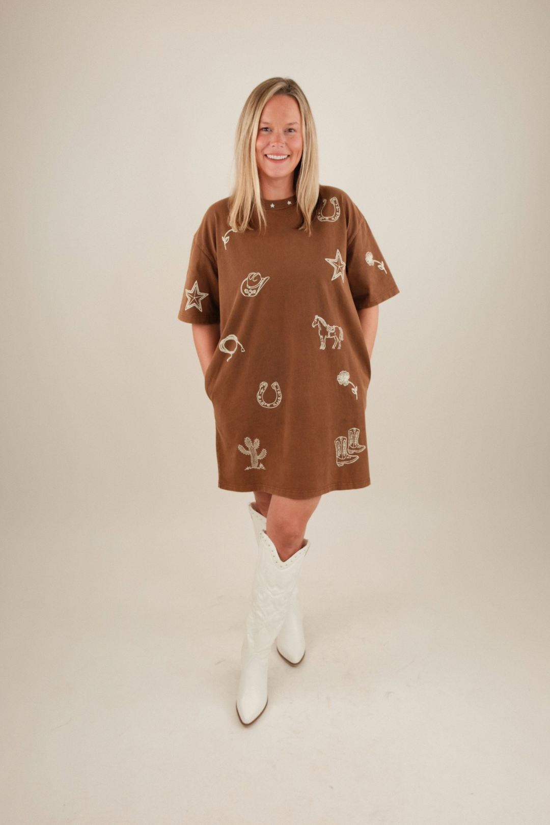 The Stardust Trail T-Shirt Dress combines casual comfort with unmistakable western flair. Designed in a soft black or brown mineral wash, this relaxed-fit dress is patterned with bold white western motifs for a lived-in yet stylish vibe. The neckline steals the show, detailed with dainty embroidered stars that add a touch of cowgirl magic.