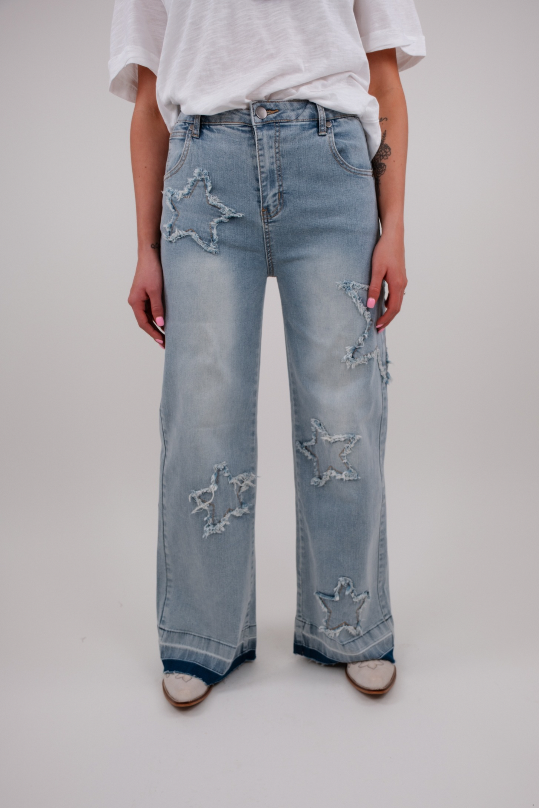 The Starlight Fringe Jeans are made for the dreamers and drifters. These medium wash wide-leg jeans feature denim star patches with raw, frayed edges, giving them a bold, rebellious flair. The unfinished hem and washed detailing throughout add to their laid-back, vintage-inspired vibe.