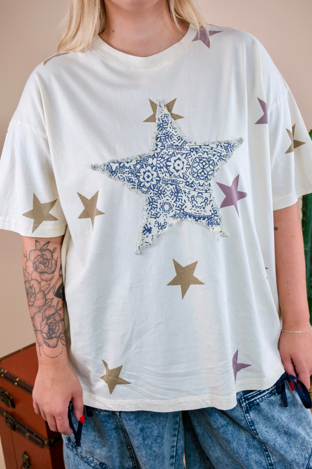 Add a bit of sparkle to your everyday wardrobe with our Starry Horizon Tee. Featuring mauve and taupe stars scattered across the fabric, this basic yet stylish tee has a bold, stitched star on the front with a unique design in the middle. The soft cream color provides a neutral base, while the star details give it a pop of western-inspired charm.