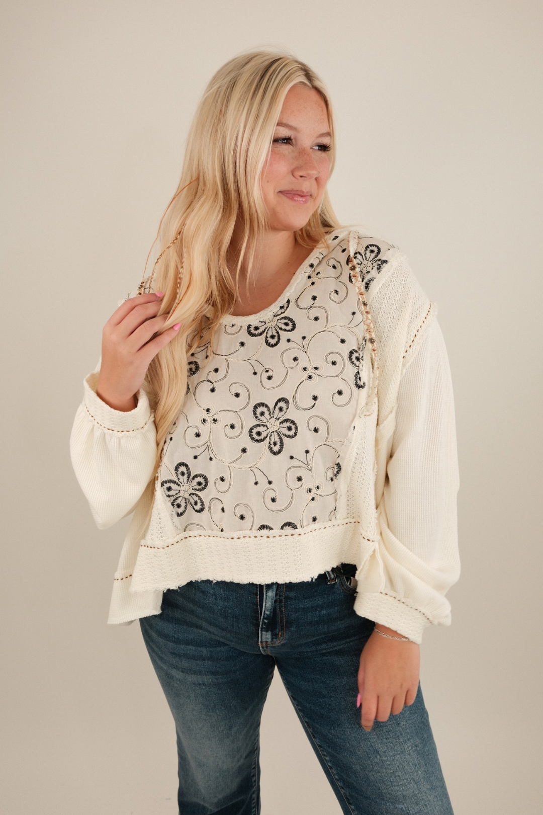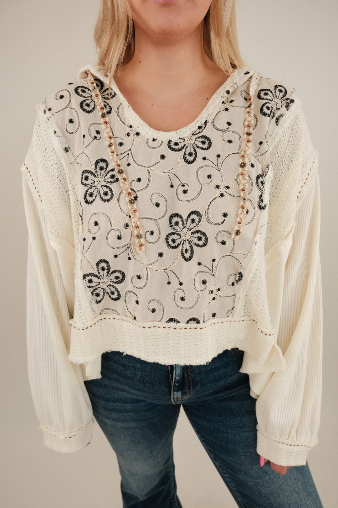 Soft, romantic, and full of western charm, the Stone Whisper Patchwork Hoodie blends cozy textures with delicate details for a truly one-of-a-kind look. This scoop neck cropped hoodie is crafted from a dreamy mix of cream waffle knit, airy lace, and floral-embroidered panels, giving it a handcrafted patchwork feel. The drawstring is adorned with dainty sewn-on stones, adding a subtle, earthy sparkle that makes this piece extra special. Perfect for pairing with high-rise jeans, a flowing skirt, or even layered over a dress, it’s a versatile piece for any free-spirited cowgirl’s wardrobe.