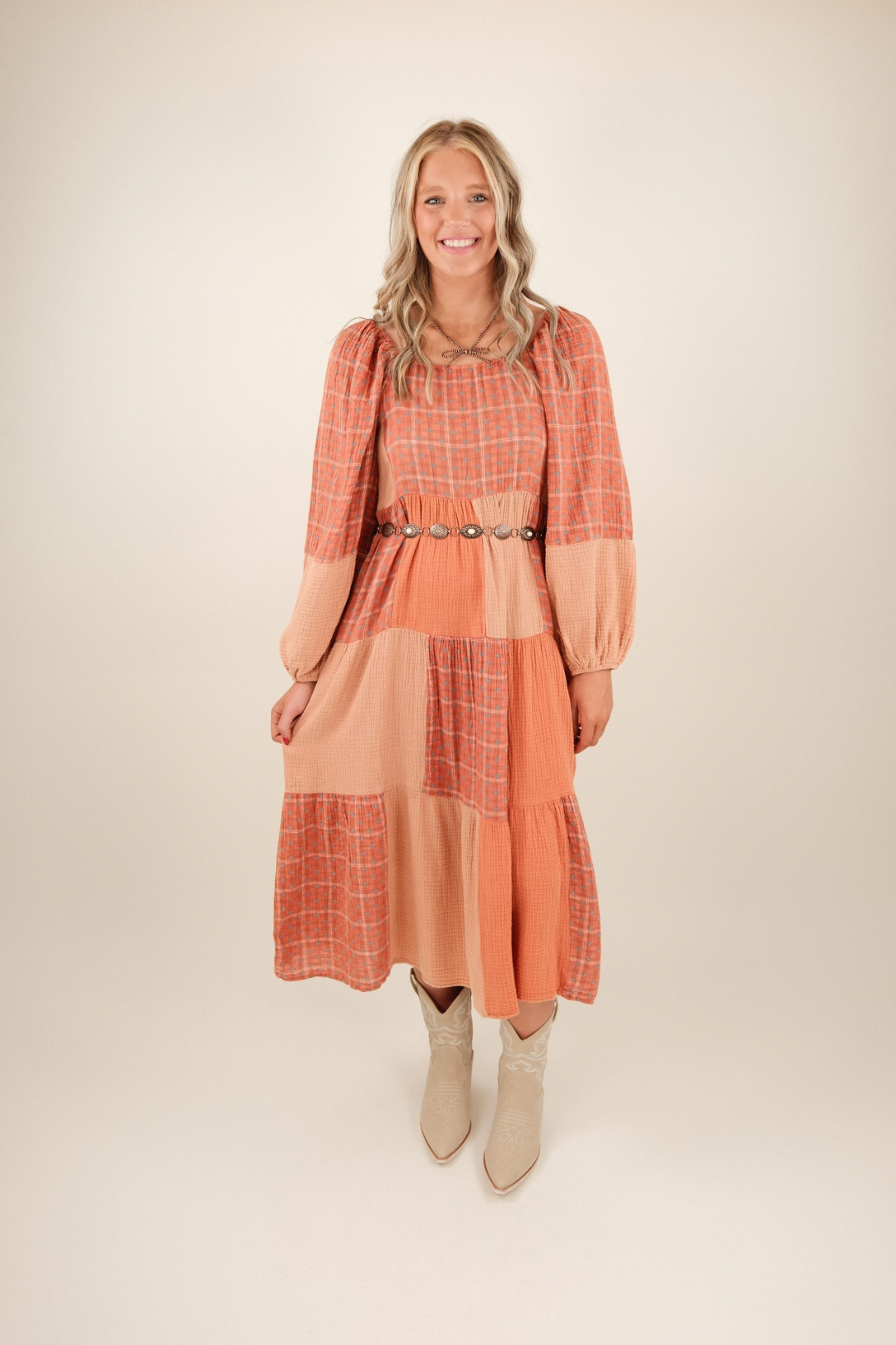 The Sundance Patchwork Maxi Dress is where prairie soul meets modern western charm. With its rich tapestry of burnt orange hues and varied textures—from muslin to plaid to solid cotton—this statement dress is a true showstopper.