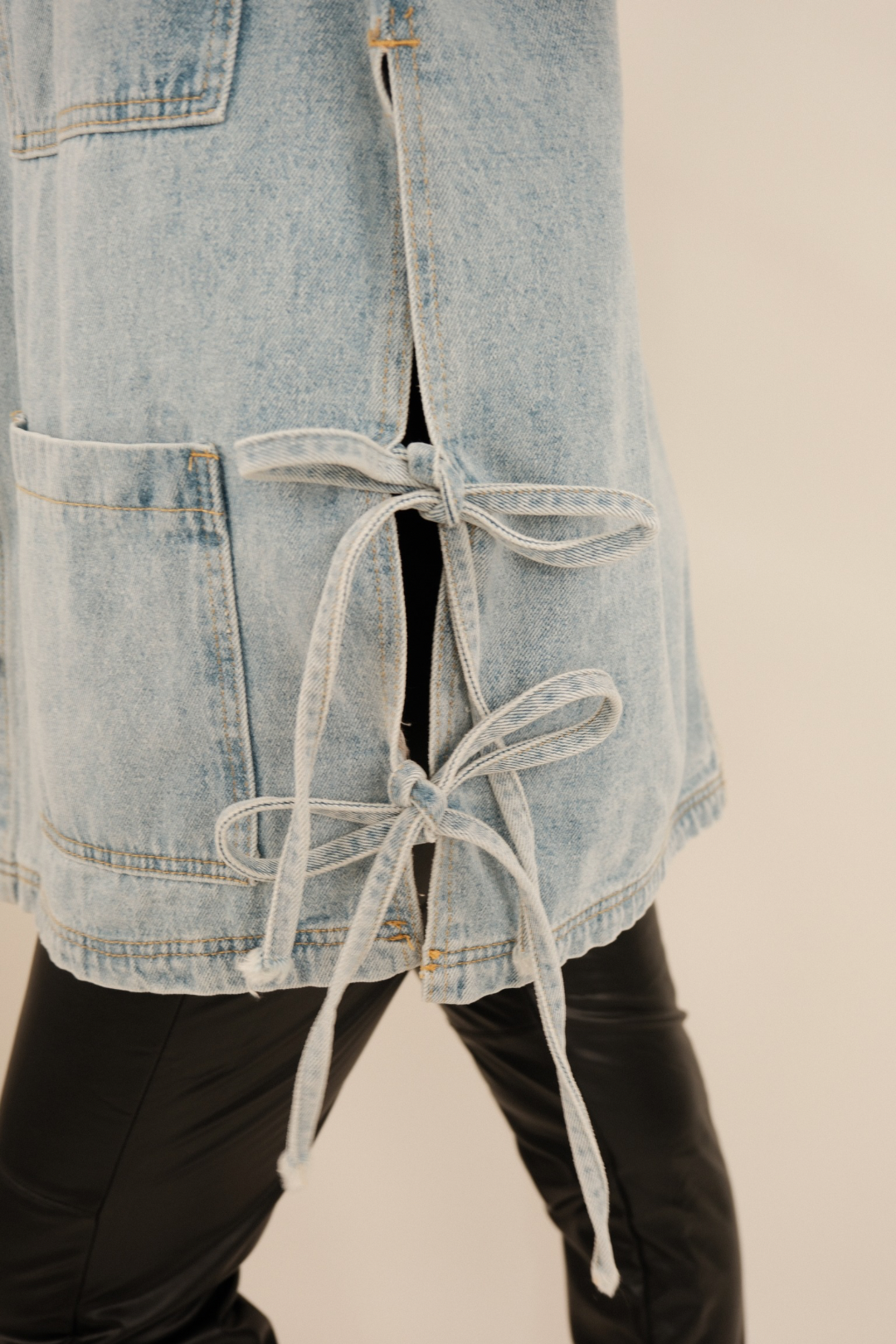 The Sundown Canyon Tie Jacket is a dreamy blend of boho ease and rugged denim charm. Made from light-washed denim, this oversized jacket features three side ties on each side for a unique, flowy silhouette and added adjustability. Functional front buttons and pockets bring utility to its relaxed, artistic vibe.