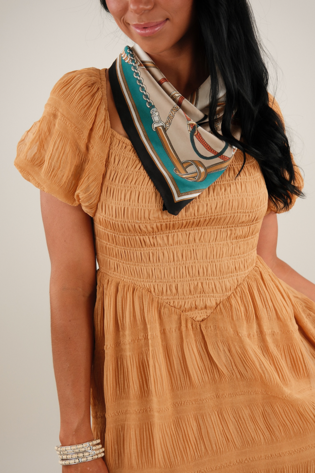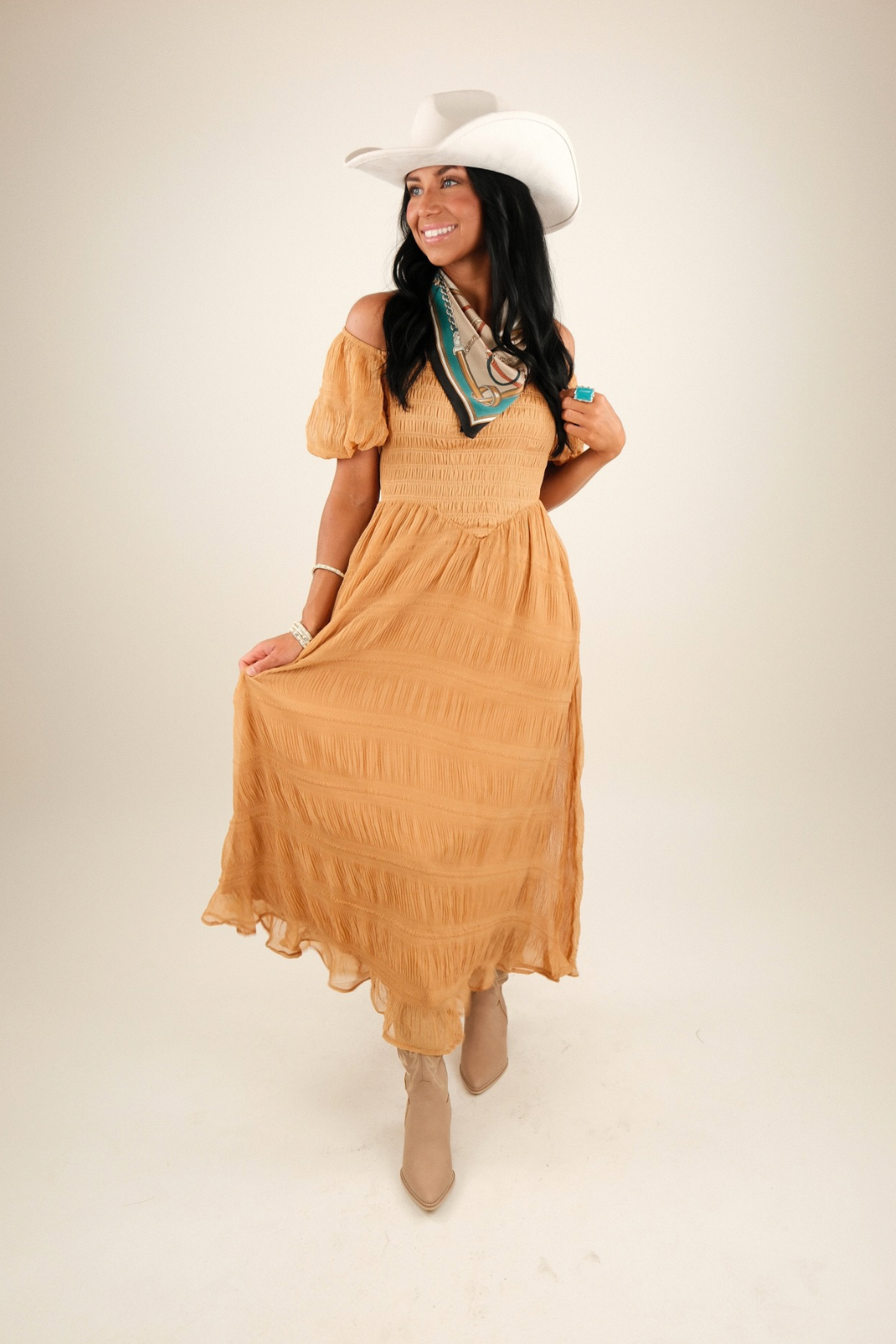 Bask in the golden glow of western charm with the Sunset Sagebrush Midi. This smocked puff sleeve midi dress is the perfect mix of rustic femininity and comfort. Crafted in a dreamy gauzy fabric with a rich ginger hue, it brings warmth and texture to your wardrobe like a desert sunset.