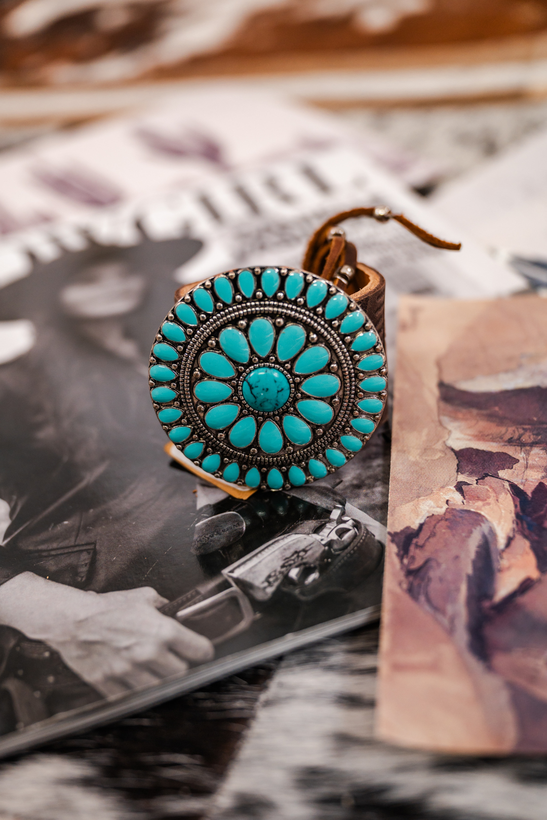 Handcrafted right here in Texas, the Texas Turquoise Concho Leather Cuff is a true showpiece for any western-loving soul. Made from thick, beautifully tooled leather, this custom-designed cuff showcases authentic craftsmanship with every carved detail. At the center sits a striking turquoise concho, adding a bold pop of color and classic southwestern flair that instantly elevates your look.