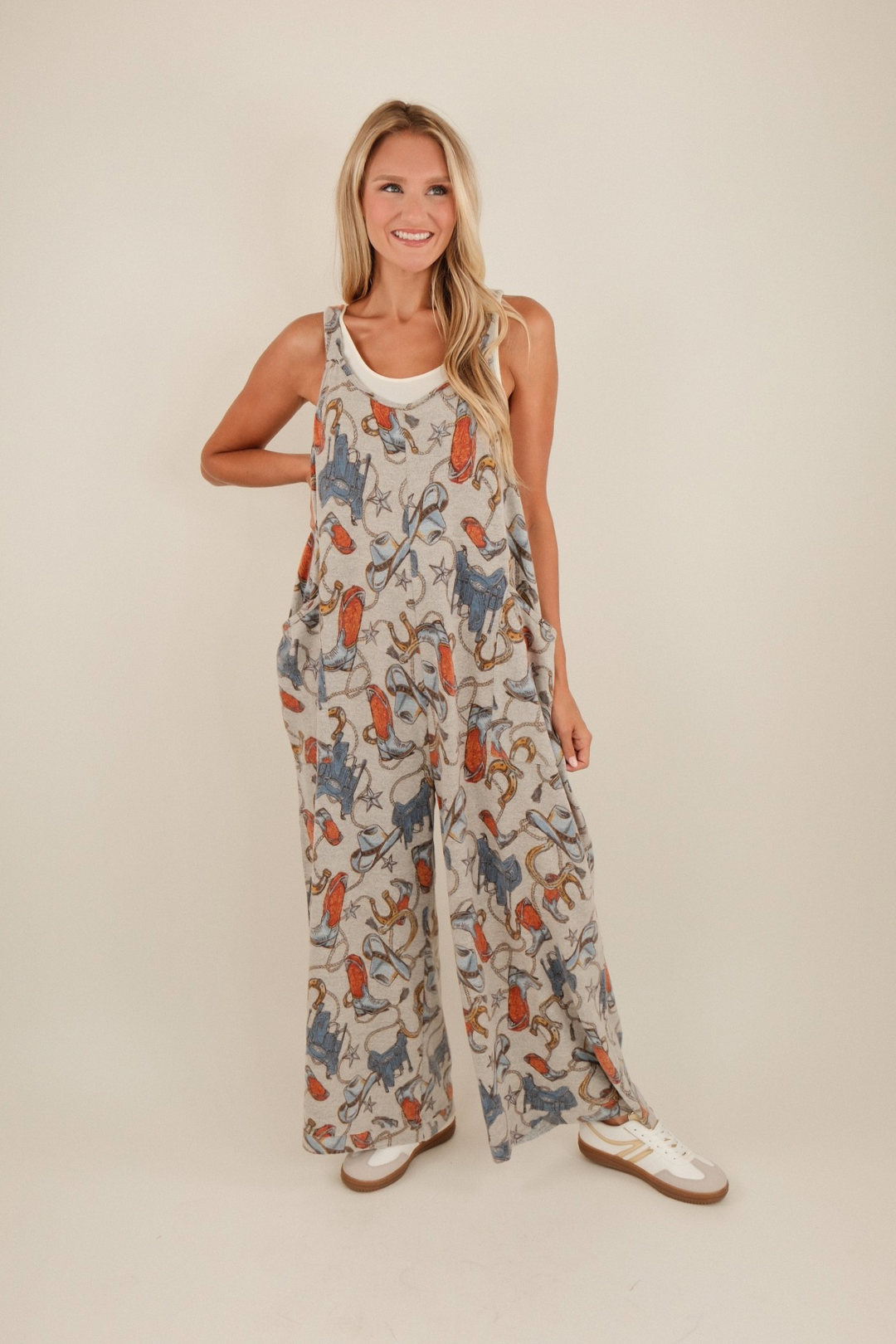 Saddle up in cozy western charm with the Buckaroo Breeze Overalls. Made from an ultra-soft brushed fabric that feels like a dream, these oversized grey overalls blend laid-back comfort with vintage rodeo flair. Featuring a rustic palette of blue and rust, the all-over western print brings to life rope loops, saddle silhouettes, galloping horses, stars, boots, and lucky horseshoes. With adjustable straps and roomy pockets, this statement piece is ready for campfires, county fairs, and everyday cowgirl ease.