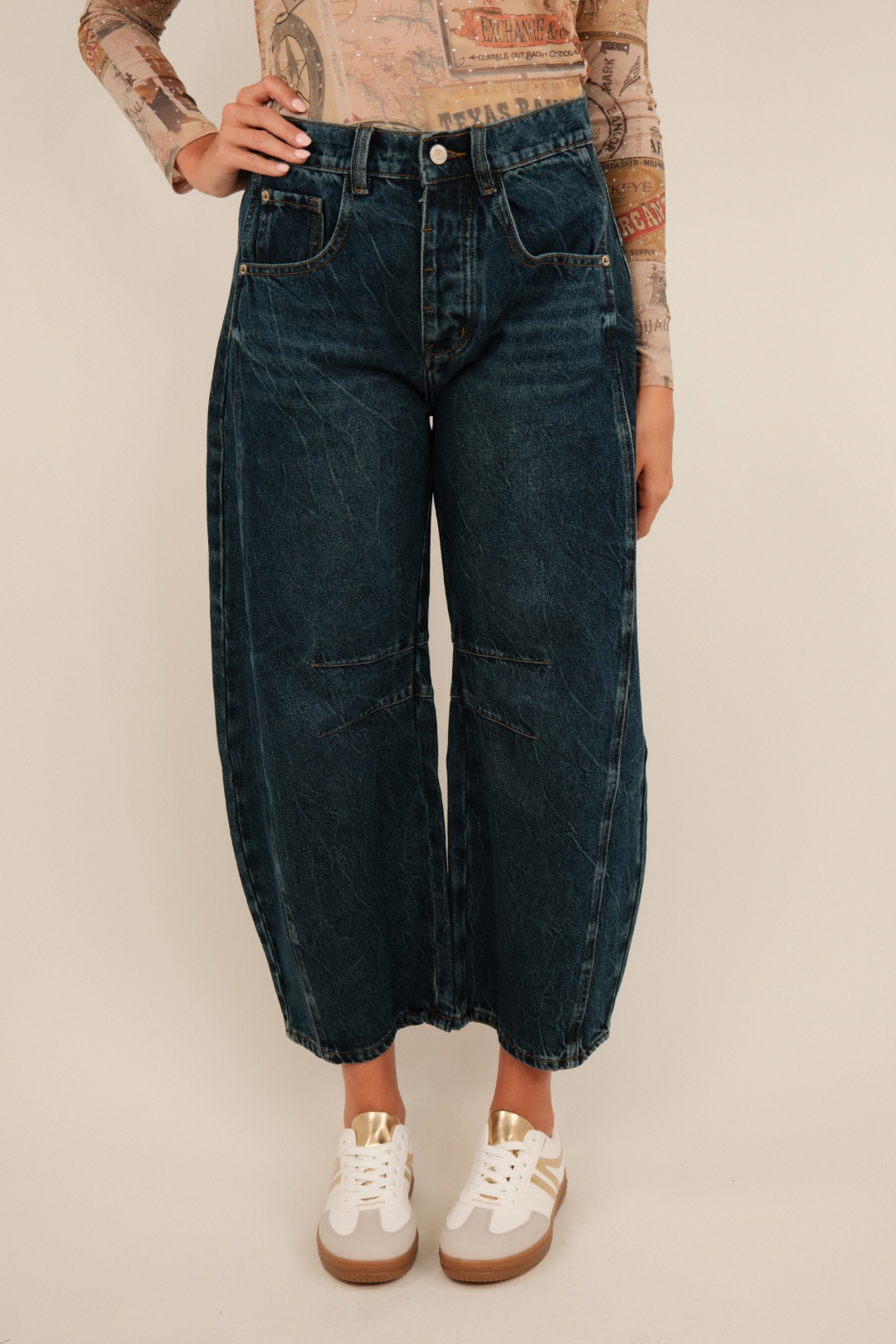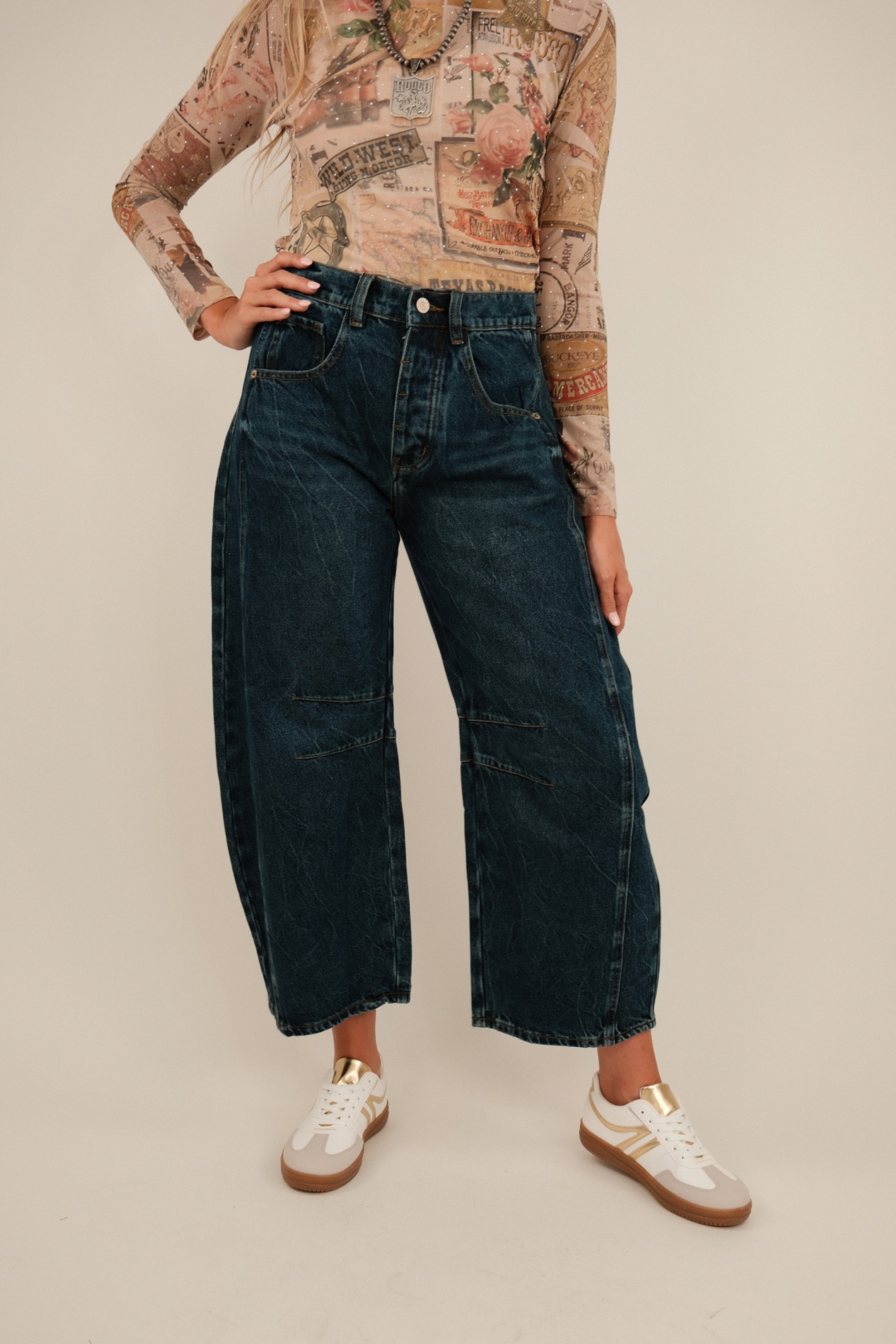 The Trail Ridge Barrel Dark Wash Jeans are your new go-to for rugged charm and flattering fit. Designed in a rich dark wash, these high-rise jeans feature a trending barrel-leg silhouette that tapers slightly for a modern cowgirl edge. With an ankle-cropped length and structured shape, they're perfect for showing off your boots or a statement heel.