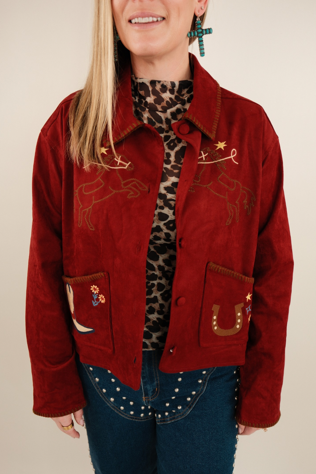 Crafted from buttery faux suede, this jacket features a collared neckline, button-down front, and front patch pockets, all outlined in contrast blanket stitching for that handmade, heritage-inspired look. The standout detail? Western-style embroidery across the front, pockets, and back — adding artful texture and authentic rodeo spirit.