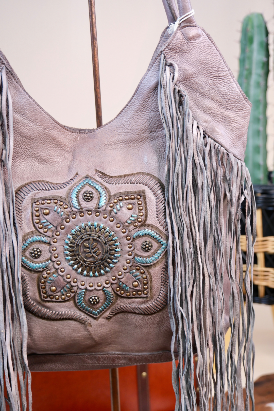 The star of the show is the centerpiece floral design, crafted from turquoise leather and accented with bronze studs, radiating rustic elegance in every petal. Whether you're headed to the market or a night out, this tote brings both function and frontier flair.