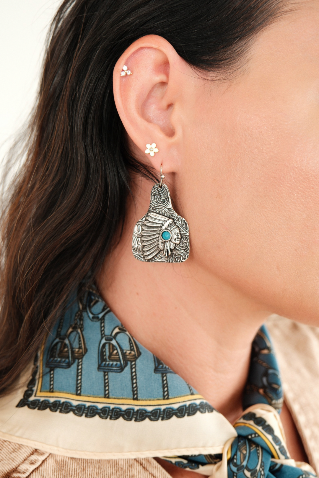 These Western-inspired earrings feature a unique cow tag shape, crafted in silver and adorned with intricate detailing. The earrings feature an Indian design with a vibrant turquoise stone, adding a pop of color and Southwestern flair. The tooling design on the background enhances the rustic charm of these earrings, making them the perfect accessory to complete any Western, boho, or rustic look.