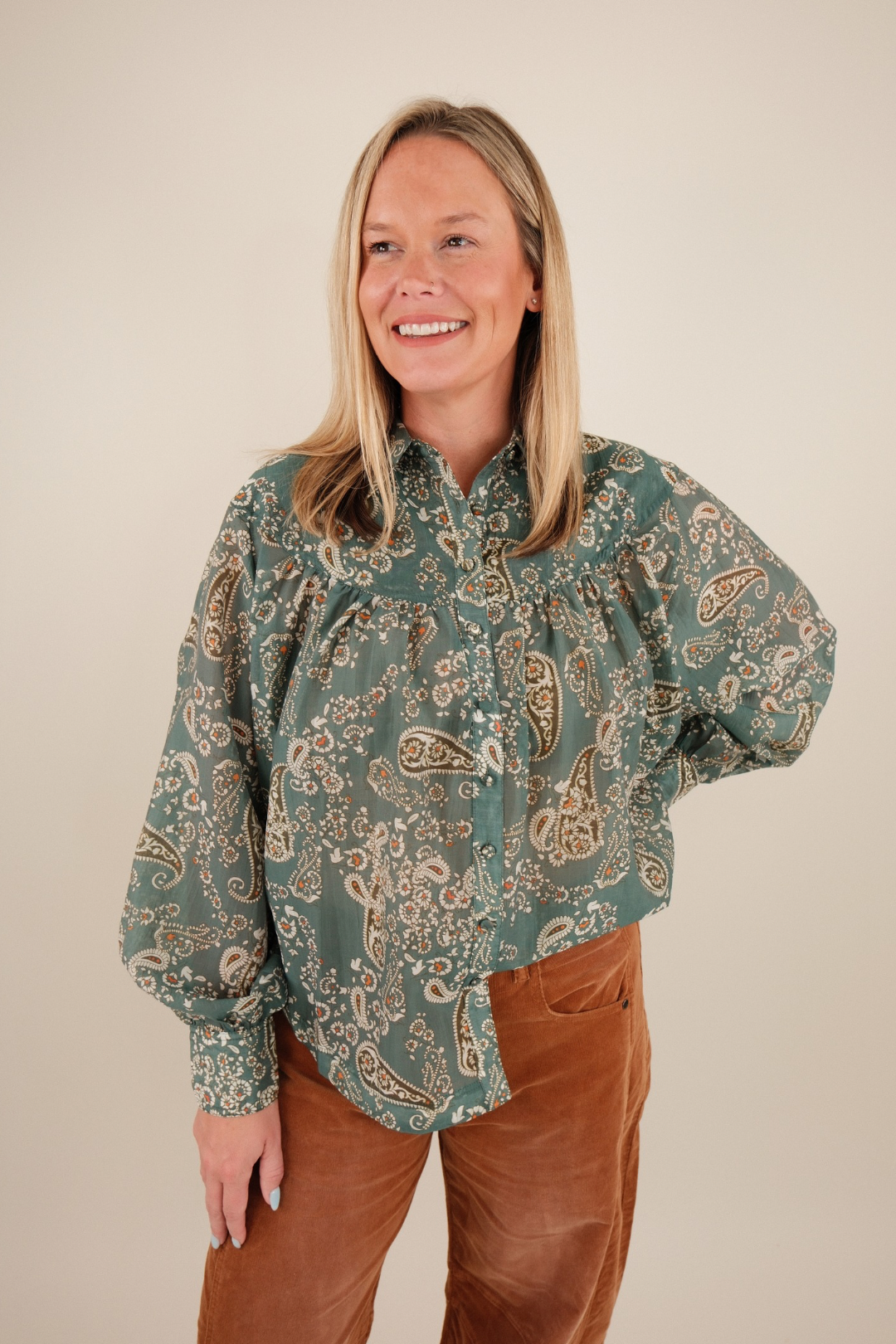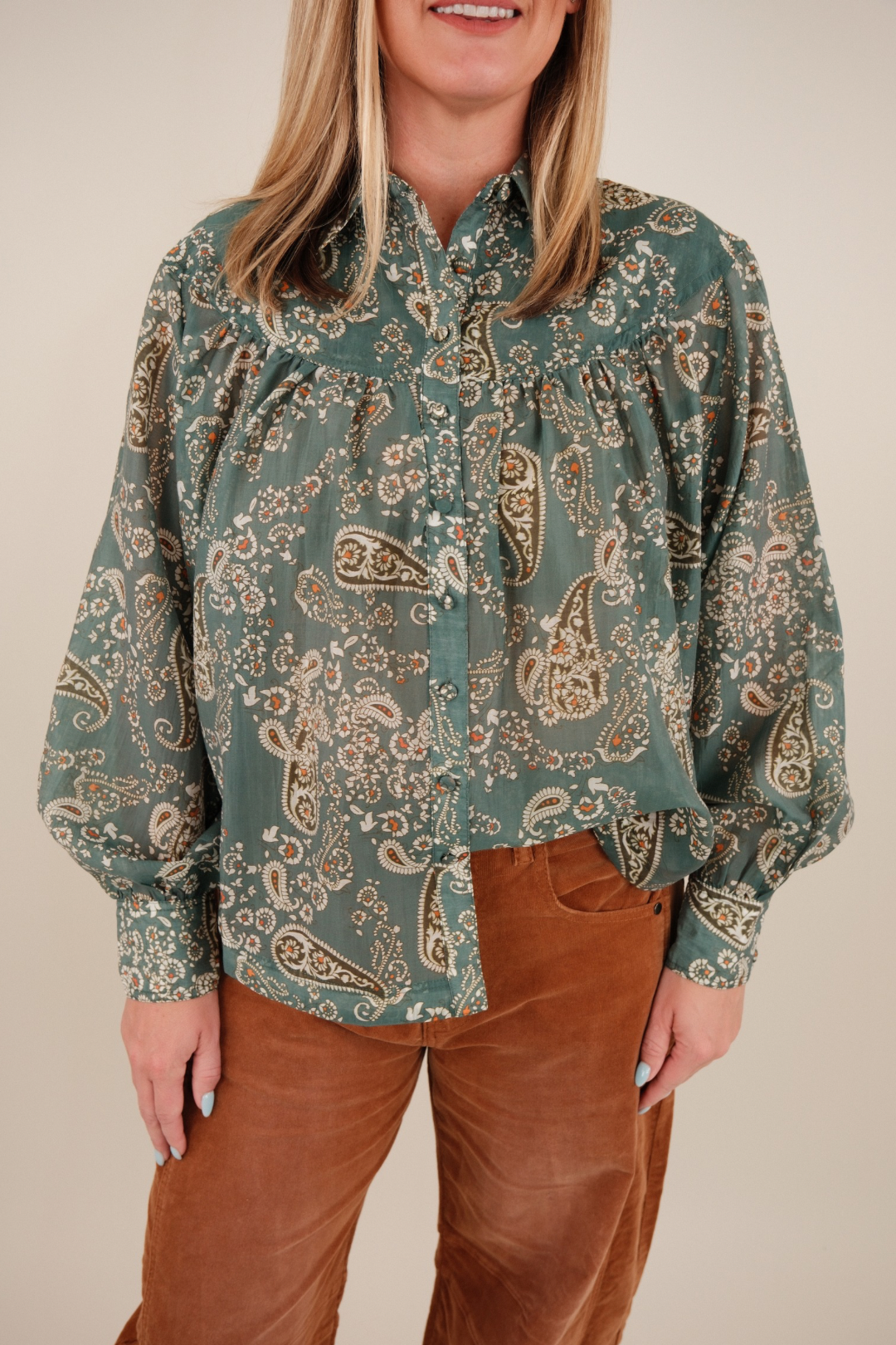 Elevate your western wardrobe with the Turquoise Sky Paisley Blouse, a lightweight collared button-down designed for timeless style. Featuring an allover paisley print in a rich teal hue, this blouse brings a bold yet refined look that pairs perfectly with denim, skirts, or layered under vests and jackets. The long sleeves and breathable fabric make it versatile enough for year-round wear, whether you’re heading to the rodeo, the office, or a night out.