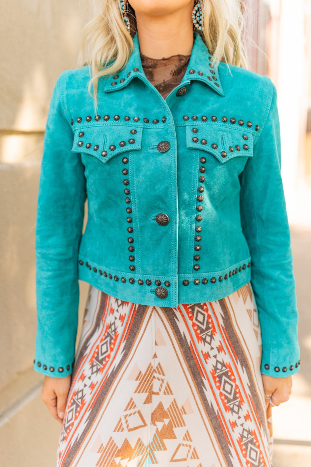 The Turquoise Suede Studded Jacket is a statement piece that combines western charm with modern style, making it an essential addition to your wardrobe.