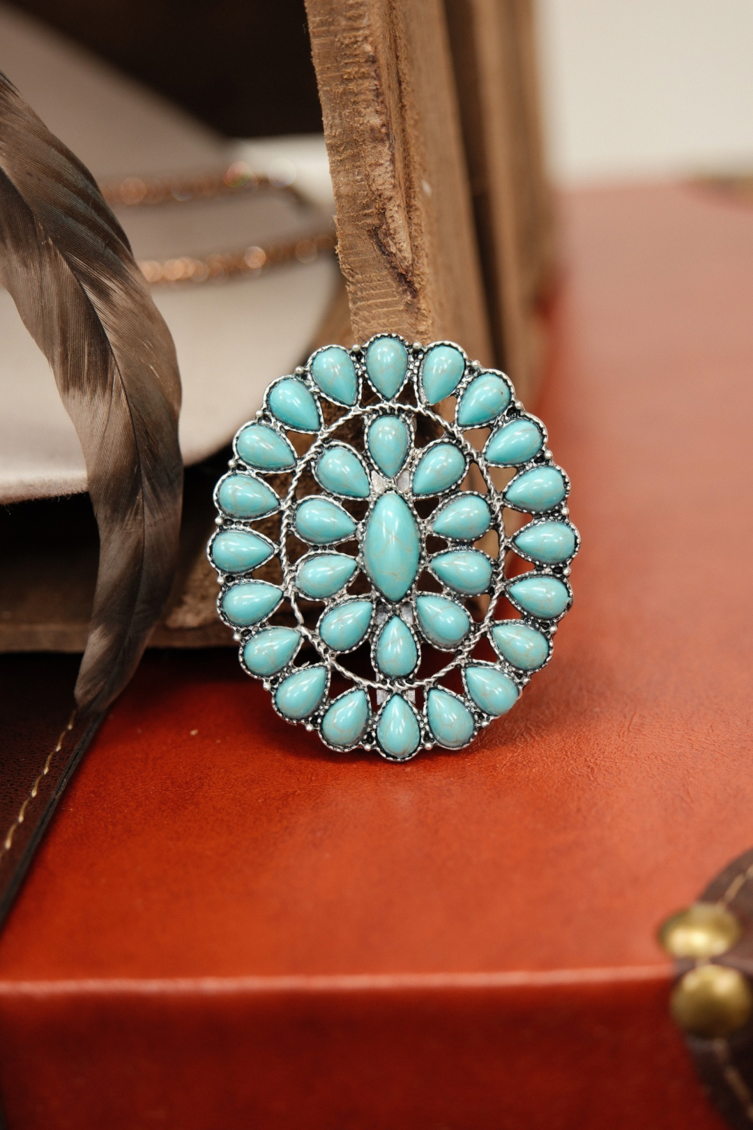 Bring a pop of color to your wild rag with the Turquoise Trail Scarf Brooch—a beautifully bold accessory designed to clip atop your favorite leather scarf slide. Featuring turquoise-toned stones set in a vintage silver-tone frame, this piece channels the heart of the Southwest with effortless grace. Whether you're dressing up denim or layering over a prairie dress, this brooch is your go-to for cowgirl glam with earthy roots.