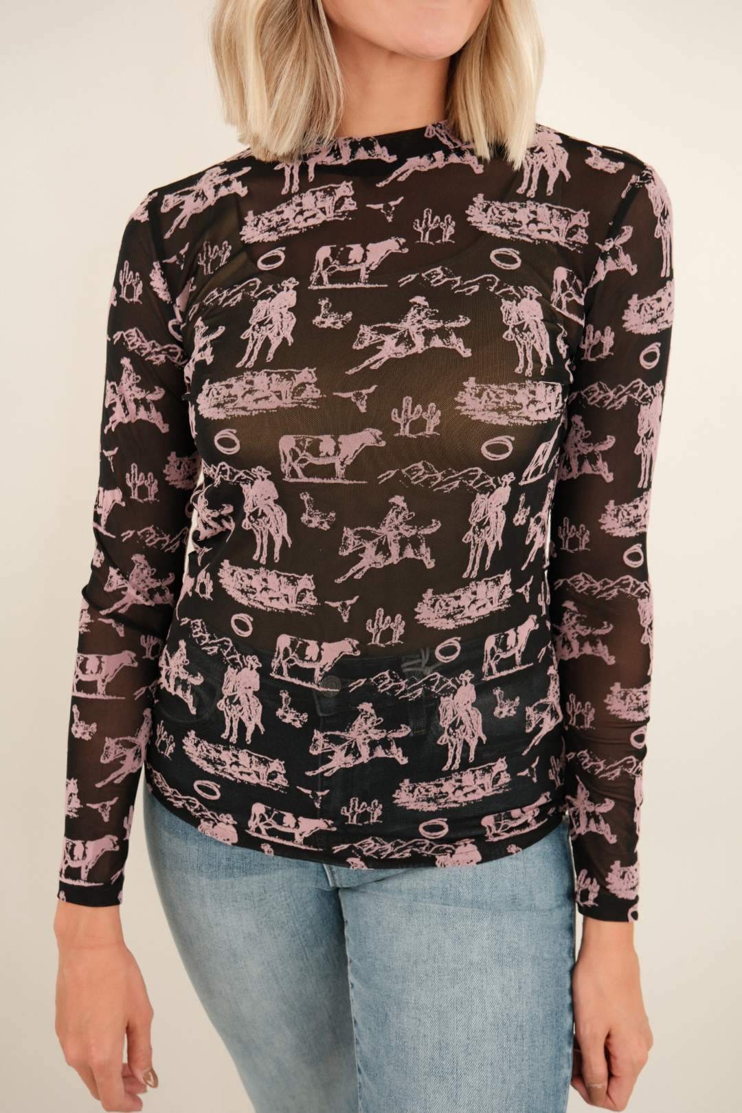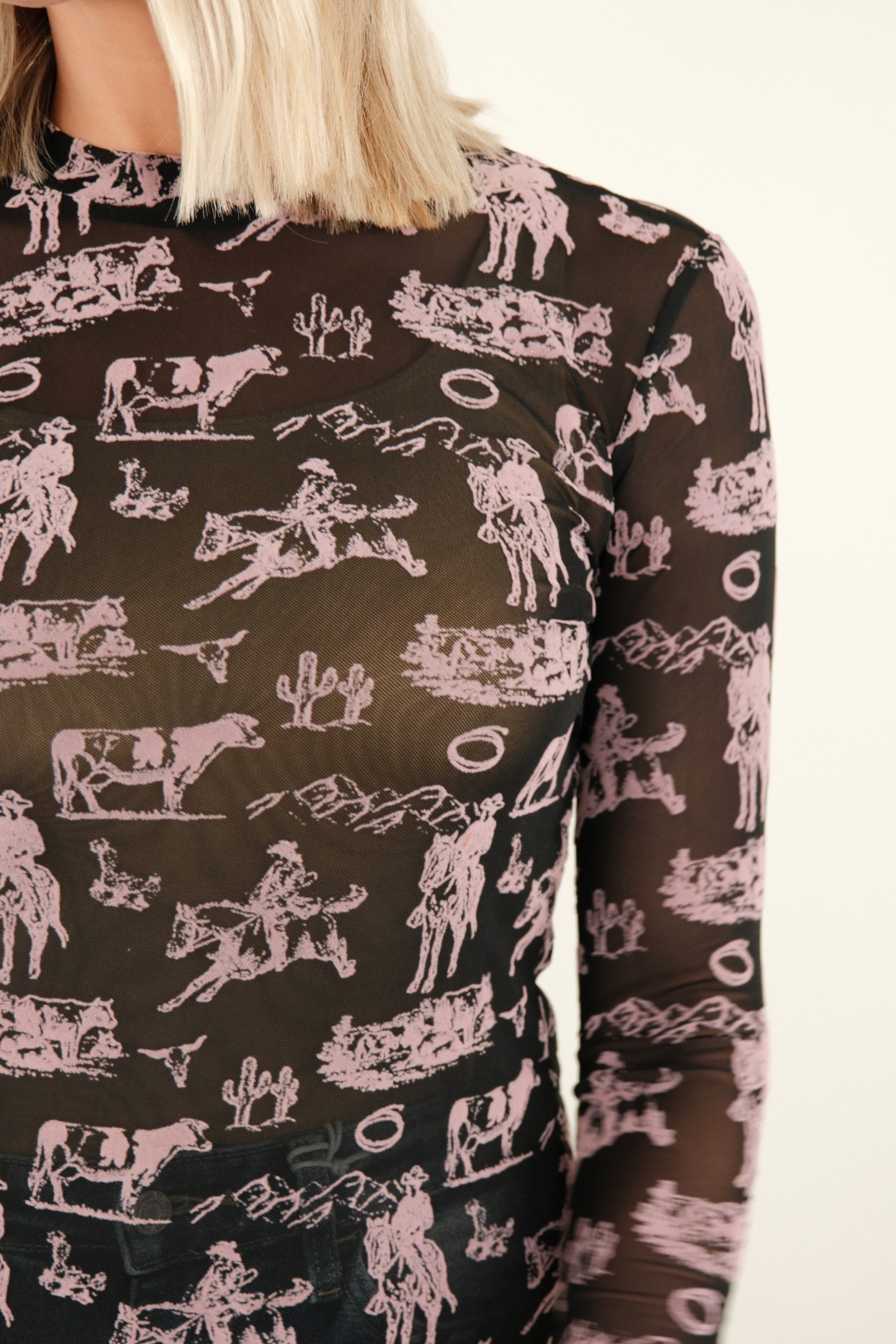 The Velvet Dreams Mesh Top brings high-fashion texture to classic western motifs. Crafted from sleek black mesh, this long sleeve top is covered in soft light pink 3D velvet designs featuring cowboys atop horses, bulls, ropes, and desert cacti. The sheer-meets-velvet contrast creates striking dimension, making this piece perfect for layering or wearing solo as a bold statement.