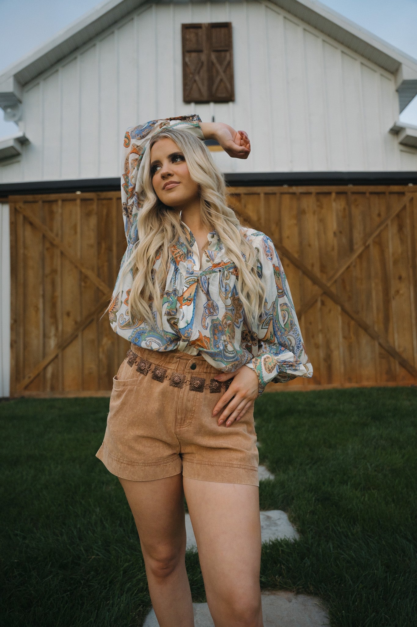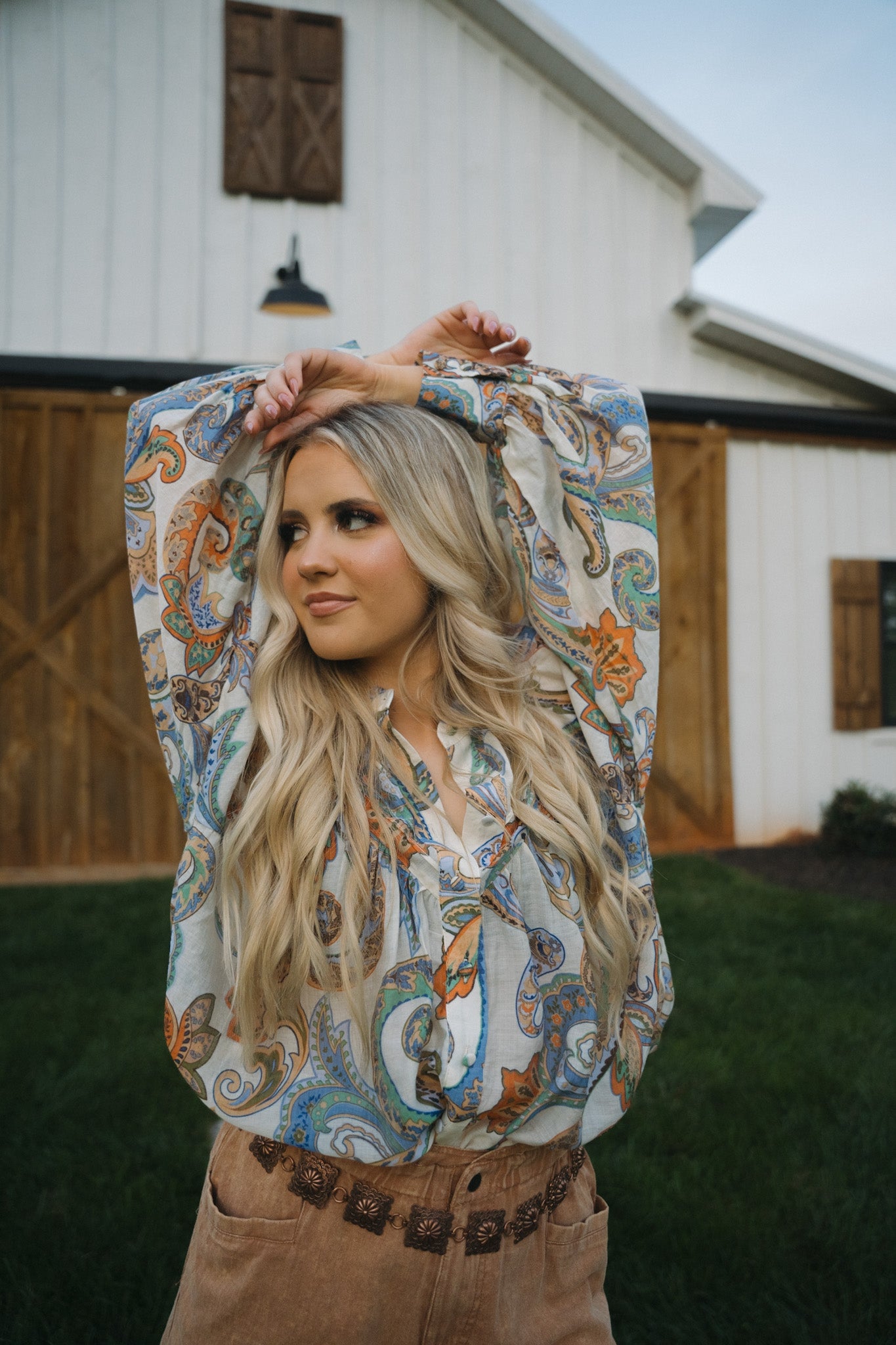 Romantic and effortlessly Western, our Wanderlight Sheer Blouse is a dreamy statement piece with an ivory base and flowing bell sleeves. Designed with a soft wrinkled texture and intricate all-over patterning in rich tones of rust, blue, green, black, tan, and brown, it brings color and character to every outfit.
